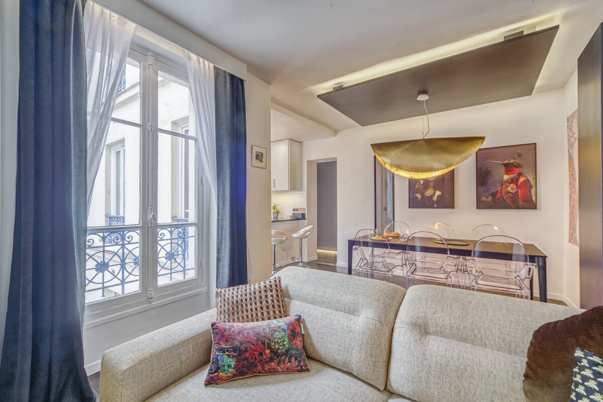 Appartamento climatizzato di 60 m2 con arredamento di lusso nel pieno centro di Parigi quartiere storico di Montorgueil, famoso per i suoi negozi di alimentari, i suoi piccoli bistrot e ristoranti. L'appartamento si trova al 1° piano di un edificio in una strada molto tranquilla. È stato ristrutturato nel 2023 da un famoso architetto e quindi molto ben organizzato con attrezzature di altissimo livello. Vi sentirete come in una suite d'albergo con il fascino in più, di un vero e proprio alloggio parigino.