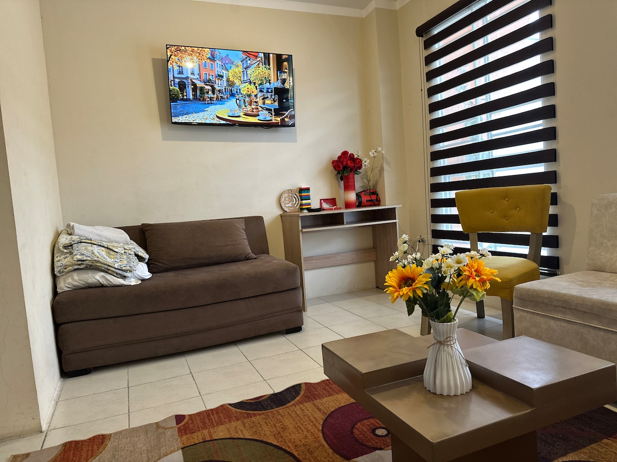 Goditi un'esperienza elegante in questa suite situata di fronte al centro commerciale più importante della città. Una zona sicura con tutti i servizi a pochi metri da te. 1 camera matrimoniale con bagno privato Soggiorno/sala da pranzo con bagno per gli ospiti. Divano letto Patio con amaca Frigorifero e cucina completa. Smart TV A/C Parcheggio privato gratuito Farmacie e aree commerciali molto vicine Perfetto per coppie o viaggiatori singoli in cerca di comfort e una posizione privilegiata.