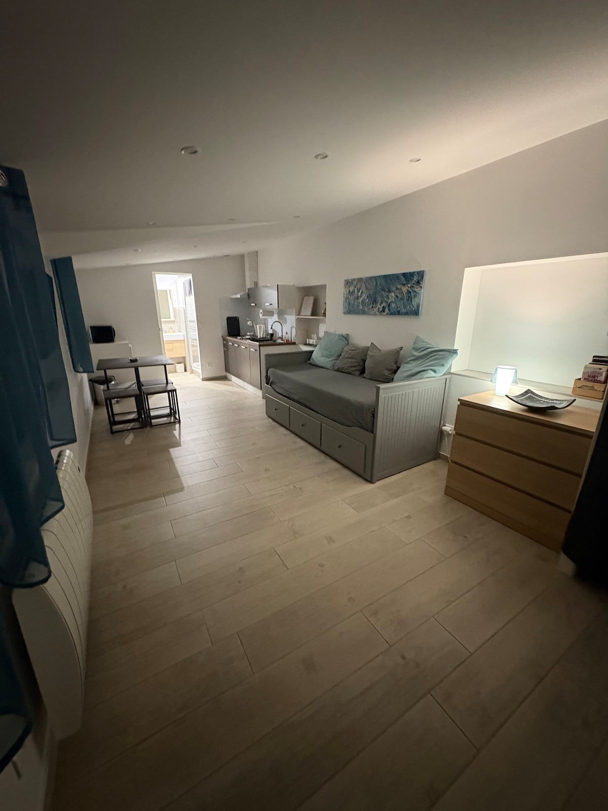 Monolocale 30m2 molto ben attrezzato al piano terra della nostra villa. Situato in una zona tranquilla vicino al Parco Nazionale delle Calanques (Morgiou e Sormiou). Parcheggio custodito nella lottizzazione. Terrazza privata. letto (160×200), TV, bagno con grande doccia+WC+lavandino.... Cucina attrezzata (forno escluso). Piastra elettrica per uso esterno. supermercato a 2 minuti e spiagge a 10 minuti di auto. Il monolocale è indipendente, l'accesso è attraverso il nostro giardino.