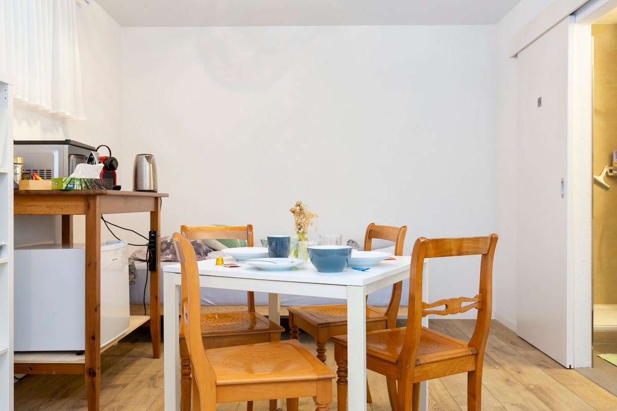 Camera privata e luminosa di 30 m² con ingresso indipendente, bagno privato e parcheggio gratuito – ideale per viaggi di lavoro e di piacere. Dotazioni: 4 letti singoli (90×200) + culla, seggiolone Luce diurna, Wi-Fi Tavolo da pranzo con 4 sedie Bagno con doccia/WC/lavabo Caffè Nespresso e tè gratuiti Frigorifero, forno a microonde, bollitore (senza fornelli) Extra: Cross trainer gratuito Parcheggio gratuito direttamente presso la casa Importante: Nessuna cucina disponibile (nessun angolo cottura/nessun fornello)