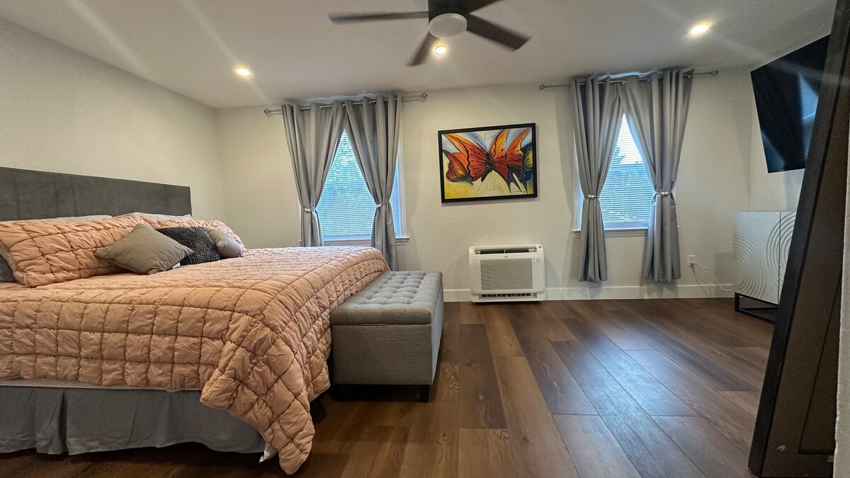 Appartamento con letto king size e armadi/pavimento in legno di ciliegio