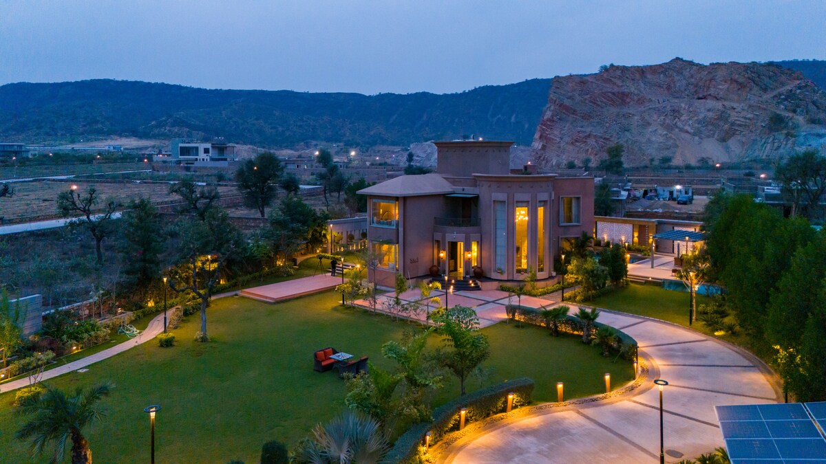Immerso in un tranquillo quartiere residenziale a Jagatpura, Aarrunya è la scelta perfetta per soggiorni in famiglia, lune di miele, vacanze rilassanti con gli amici e ritiri contemplativi in solitaria. Il suo design rustico e moderno è evidente nelle pareti in mattoni a vista e nelle grandi finestre rivolte a est, che inondano la casa di una brillante luce naturale. Nel prato profumato, le farfalle bianche svolazzano tra i ciliegi appena piantati e l'allegro canto degli uccelli si può ascoltare per tutto il giorno.