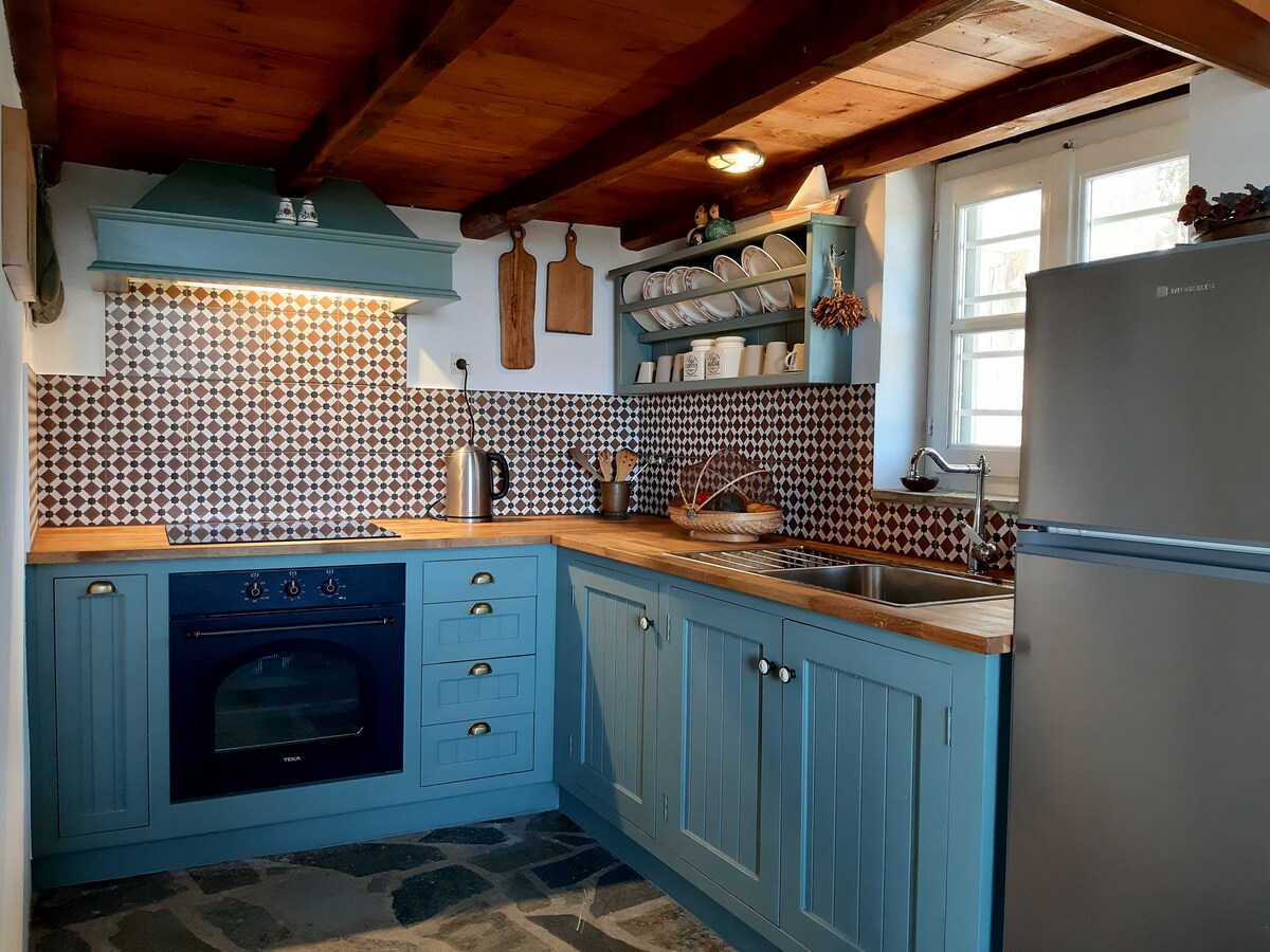 Lavender cottage, one of the three independent residences of Chroussiano Farmhouse, sets in an organic orchard, amid blossoming geraniums and olive trees, with unobstructed views to the endless Aegean blue and the nearby pine wood of Chroussa village. Built out of love and respect for the environment, it follows the Cycladic architectural tradition and radiates a homely warmth helping our guests feel in harmony with the Cycladic countryside landscape.