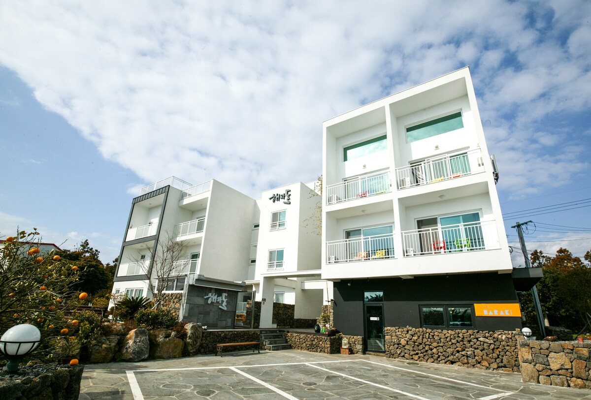 ★ Terrazza con vista sull'oceano e giardino di agrumi ★ La nostra pensione si trova in un piccolo villaggio di pescatori chiamato Mangjangpo, sulla Olae Route 5. Si tratta di un edificio esposto a sud e si trova vicino al mare di Gongcheonpo, a est dell'edificio, e al mare di Mangjangpo, a sud.È ideale per una piacevole passeggiata fino alla spiaggia, dove si trovano famosi ristoranti, caffetterie e minimarket, quindi è perfetto per rilassarsi con un pasto in un ristorante o in una caffetteria con vista sul mare.L'alloggio è un tranquillo bed and breakfast con solo 2 camere (101 e 102); la camera è uno spazio spazioso di 45 m² (circa il doppio di una camera standard di un hotel) ed è molto più grande di quanto si veda nella foto; l'unica area comune è il parcheggio. La camera privata per due persone è dotata di un letto matrimoniale e di una biancheria da letto, di un divano in tessuto a tre posti e di una TV. La cucina è decorata come uno spazio dove poter gustare vino o birra mentre si condivide la gioia di viaggiare. Se il canto degli uccelli ti sveglia al mattino, ascolta il suono delle onde sulla terrazza con vista sul giardino di agrumi e conta le stelle che fluttuano di notte.