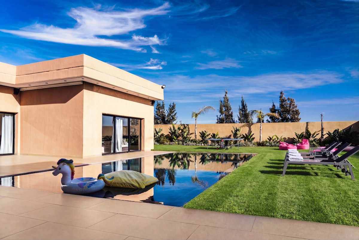 A soli 30 minuti da Agadir, questa villa di lusso di 400 m² situata in una tenuta sicura offre una privacy totale. Dispone di 5 camere da letto con bagno interno, un’ampia piscina privata e un hammam tradizionale gratuito. Il giardino paesaggistico di 1.486 m² con area giochi e zona lounge esterna con braciere garantisce un soggiorno esclusivo. Coniugando il design contemporaneo con l’eleganza marocchina, questa proprietà di lusso è il rifugio perfetto per momenti indimenticabili con la famiglia o con gli amici.