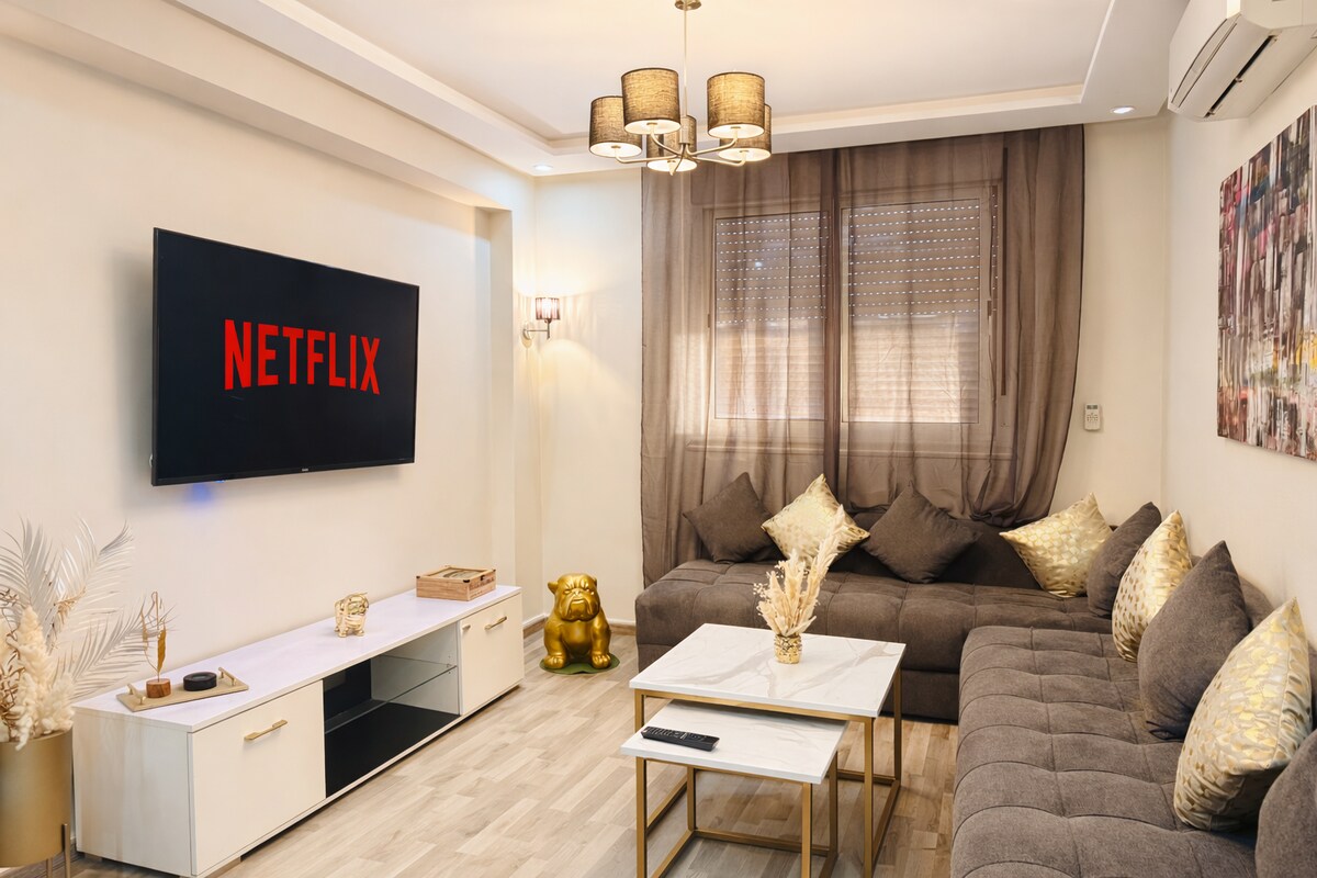 Appartamento con 3 camere da letto e 2 bagni✨ appena ristrutturato nell'esclusivo complesso Marina di Agadir. Perfetto per famiglie o amici che cercano un soggiorno tranquillo ed elegante. Spazioso, centrale e percorribile a piedi, con cucina completa, aria condizionata in ogni stanza, Smart TV e docce a pioggia. 🚫 Non adatto a gruppi di uomini single che vogliono fare festa 📄 Le coppie marocchine devono fornire un certificato di matrimonio valido.
