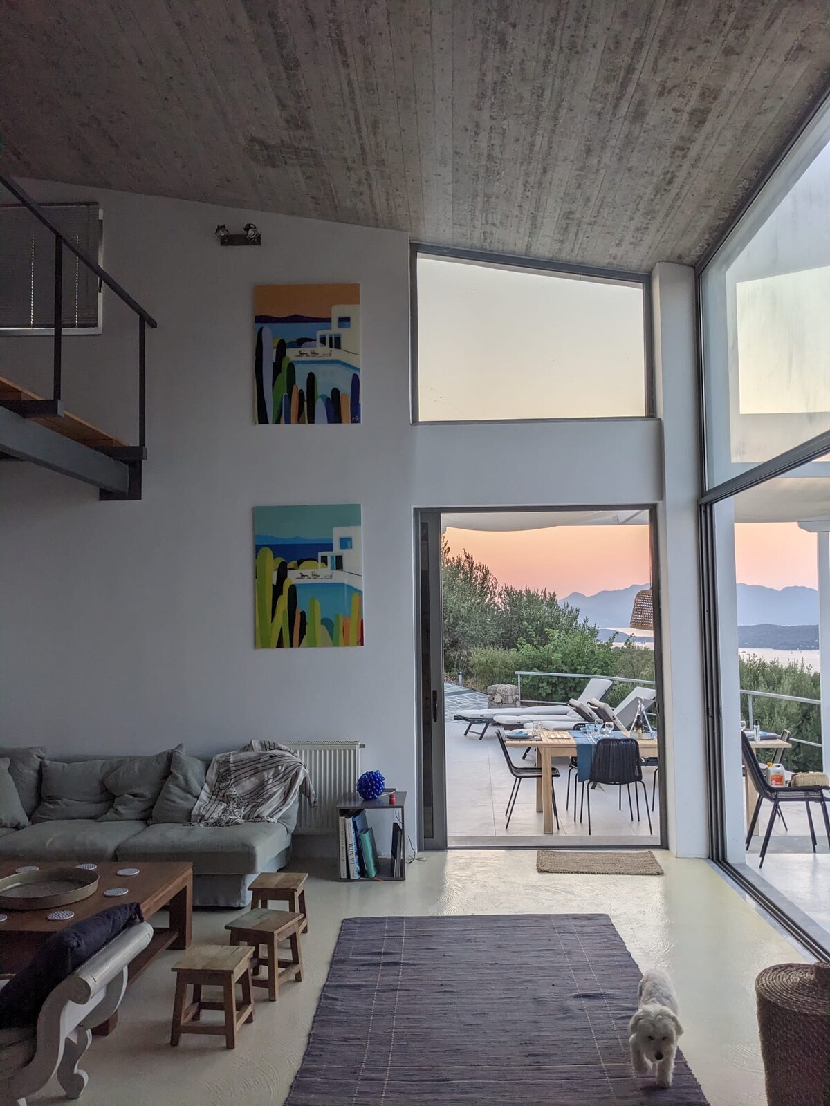 If you have seen “Glass Onion: All knives out”, it’s the villa in the intro of the movie (from 13:00-18:00). Unique location by the sea close to everything: the iconic Poseidonion Hotel, the island centre, two open-air cinemas, the market, restaurants, cafes, bars, beaches,everything in walking distance and with the best views of the sea and beautiful sunsets. 4 bedrooms, that sleep 8-10 people, all with their own bathroom, various outdoors terraces, nice spacious bright kitchen.
