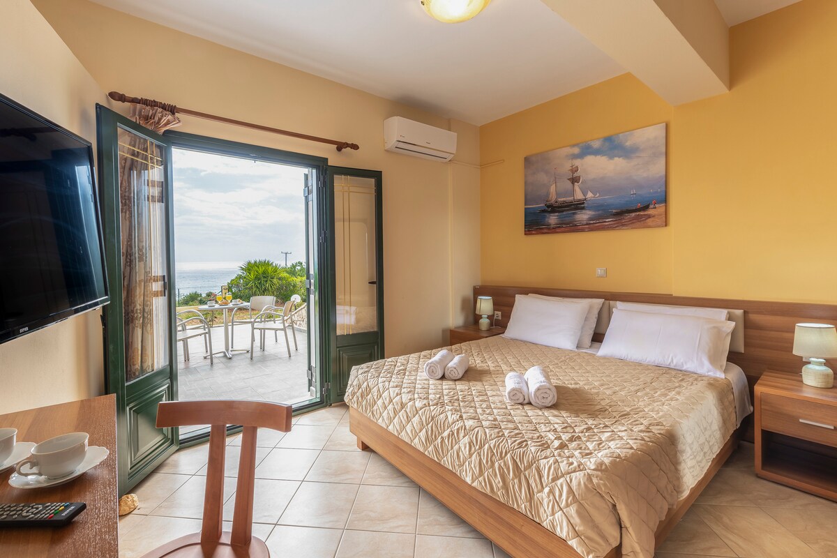 Questo monolocale è un appartamento a pianta aperta, composto da una zona giorno/notte con due letti singoli o un letto matrimoniale, bagno privato con doccia, angolo cottura completamente attrezzato (con due piastre elettriche) e un balcone o terrazza privata con vista sul Mar Ionio, sul tramonto e sulla zona della penisola di Palliki, nonché sulla costa di Cefalonia. In alcuni casi, possiamo aggiungere un divano letto che può ospitare una terza persona.