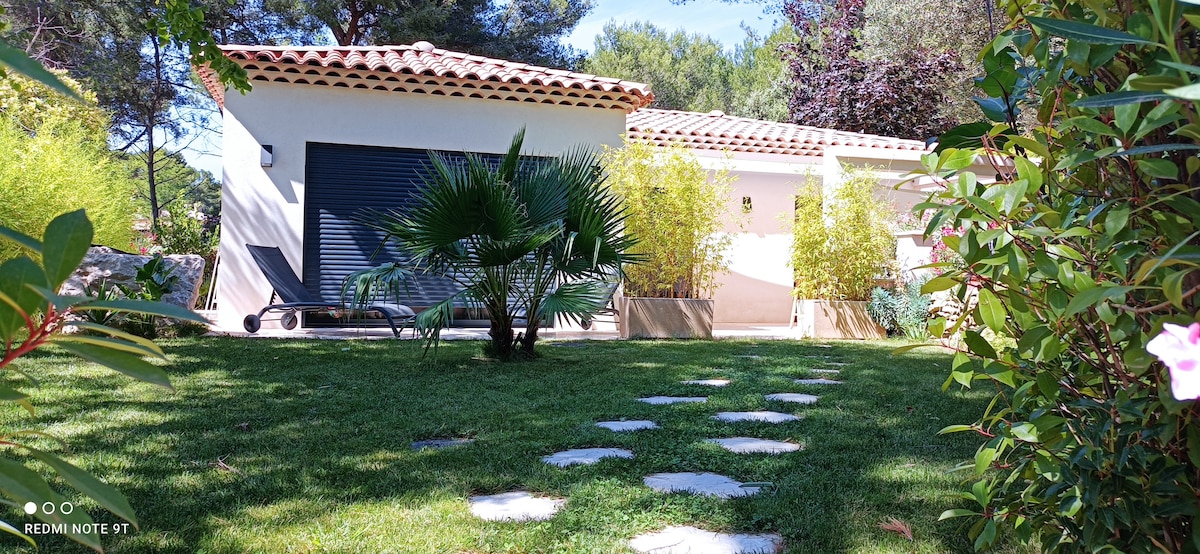 Immaginatevi di rilassarvi nella vostra vasca idromassaggio privata, nel cuore di una pineta provenzale, in una casa indipendente, tranquilla e luminosa, con terrazza esposta a sud, giardino privato e parcheggio in loco. A pochi minuti da insenature selvagge e da un centro equestre, è l'indirizzo ideale per una parentesi romantica o un soggiorno nella natura in Provenza.