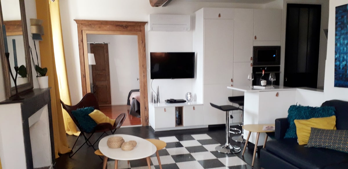 Situato nel cuore del centro della città sopra Place Charles de Gaulle, affascinante F2 di 45 m2 composto da una grande camera da letto con un letto di 160, un soggiorno con divano letto, una terrazza di 25 m2 che si affaccia su queste due stanze, una cucina aperta e un bel bagno con doccia spaziosa. 2 ° piano con ascensore e parcheggio gratuito custodito.