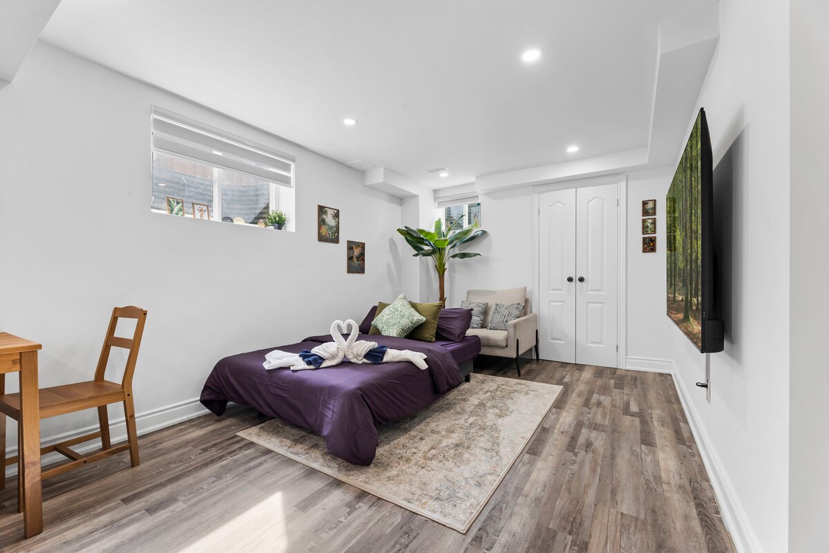Appartamento seminterrato PRIVATO con ingresso indipendente. Spazio di 39 metri quadrati. Letto matrimoniale. Doccia di grandi dimensioni con soffione a pioggia. Microonde, due mini frigoriferi, macchina per caffè/tè con acqua calda. Nota: non è una cucina completa. Tavolo da pranzo/lavoro con panche. Wifi ad alta velocità. Soggiorno con divano reclinabile Lazy Boy e Smart TV da 50 pollici. Oltre 1.000 canali TV in diretta e Netflix. Piccolo patio privato con tavolo. Vialetto privato (2 auto). 1 minuto di auto dalla Highway 401. A 15 minuti a piedi dalla stazione Ajax GO.