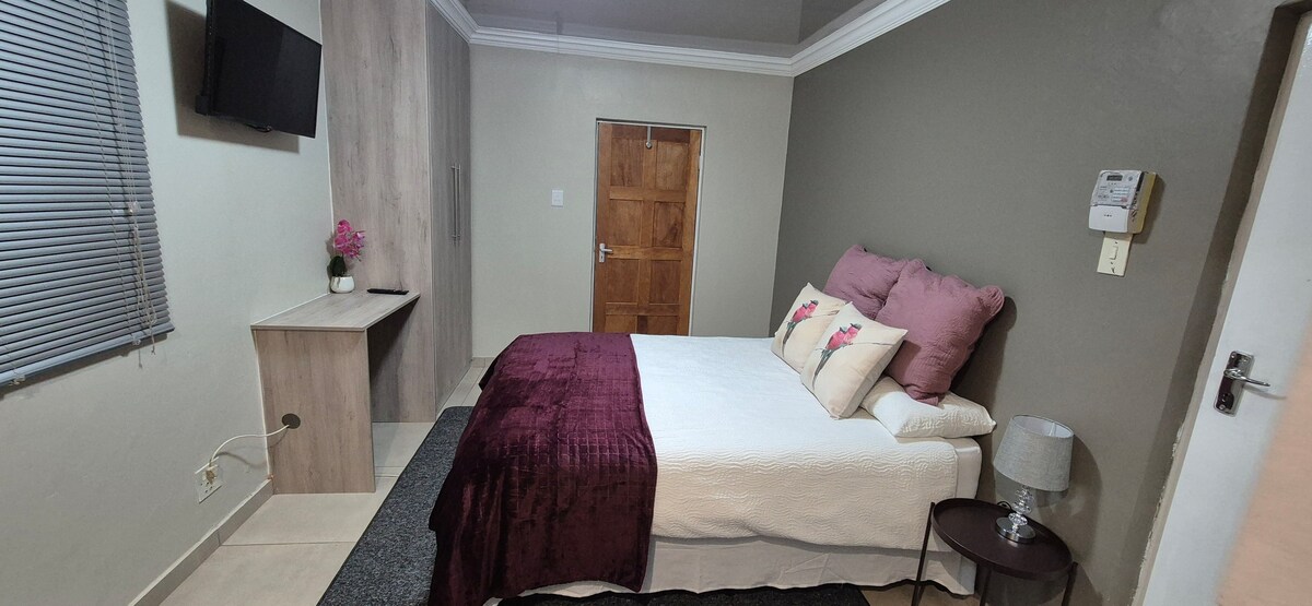 Riunisciti intorno a un'area braai privata e goditi barbecue in stile sudafricano con viste sulle piante durante il giorno e sui tramonti la sera. Le porte scorrevoli vetrate conducono a un interno spazioso e a pianta aperta, con pavimenti in piastrelle di pietra e mobili da cucina in legno naturale. Completamente compatibile con il sistema di riduzione del carico, con pannelli solari e batterie di riserva. Nessun tempo di inattività elettrica. Questo appartamento è annesso alla casa principale, ma dispone di un ingresso privato. L'intero appartamento è ad uso esclusivo degli ospiti. Questo appartamento è per 1 - 4 persone in condivisione. 1 camera da letto separata con letto matrimoniale e letto singolo e bagno privato (solo doccia). 1 WC separato. 1 letto nella zona giorno. Lo spazio a pianta aperta comprende un salotto, un tavolo da pranzo e una zona cucina. La cucina è attrezzata per la preparazione dei pasti e include frigorifero, forno a microonde, piano cottura a due piastre, mini-forno, bollitore, pentole e posate. Gli ospiti possono usufruire del wifi gratuito e di una TV a schermo piatto con pacchetto DSTV completo. L'area interna è di 95 m² e la zona braai di altri 35 m². Gli ospiti hanno accesso esclusivo a tutto l'appartamento. Procedura di self check-in. A volte non sono disponibile telefonicamente durante il giorno, ma posso sempre essere contattato tramite l'app AirBnB, SMS o e-mail. Se desideri incontrarmi, non esitare a contattarmi e ci organizziamo. L'appartamento si trova nel quartiere di Lynnwood, a Pretoria Est. È un luogo tranquillo per una corsa mattutina e una passeggiata pomeridiana. A pochi passi dalla Hoërskool Menlopark e da un negozio di alimentari. Anche il teatro Atterbury si trova nelle vicinanze. Uber è disponibile in questa zona. La strada principale con gli autobus Gautrain è raggiungibile a piedi. L'appartamento si trova al secondo piano ed è raggiungibile solo tramite scale.