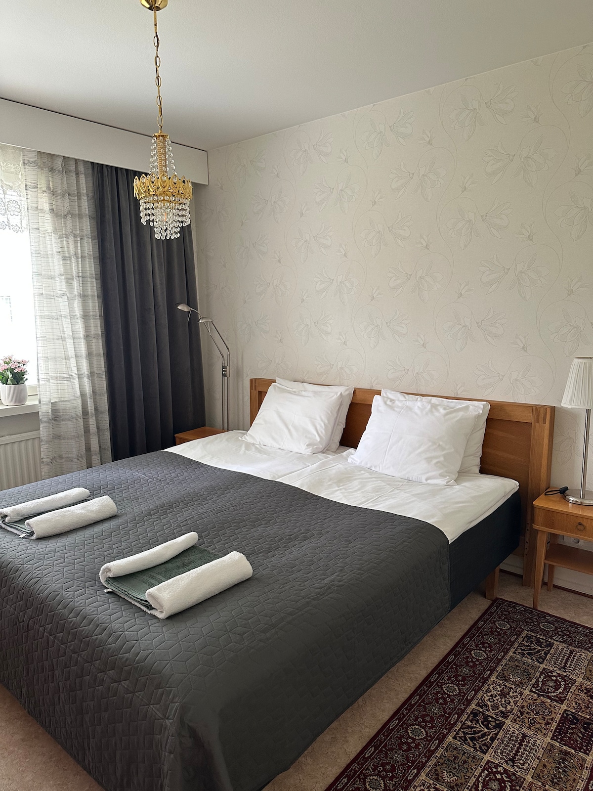 Appartamento moderno ed elegante, completamente attrezzato per tutte le tue esigenze. Può ospitare fino a 6 persone, con un letto matrimoniale (140 cm) nella camera da letto, un divano letto estraibile (140 cm) e due letti singoli pieghevoli (90 cm) nel soggiorno. L'appartamento è dotato di tutto il necessario, da una smart TV da 50"con Netflix, HBO, Yle Areena. Arredi confortevoli e moderni. Effettua il check-in tra le 15:00 e le 20:00, dopodiché la porta principale è chiusa a chiave e non potrai accedere alla cassetta delle chiavi. Non SI effettuano IL check-in dopo LE 20:00!