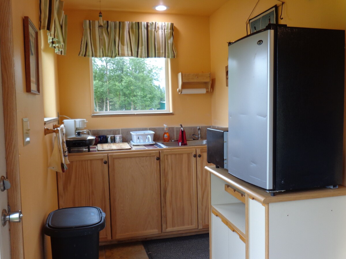 Situato in posizione centrale per un facile accesso a Homer Spit, spiagge, pesca, negozi, mercato degli agricoltori, gallerie d'arte, negozi di alimentari, birrerie, caffetterie e ristoranti. Pur essendo in centro, questa suite al piano superiore offre molta privacy, con l'ingresso che si affaccia su alti abeti e un piccolo cortile. Lo spazio è dotato di un bagno completo, 2 camere da letto con un letto matrimoniale in ogni stanza e una cucina completa. Sono disponibili il wifi e una TV con configurazione ROKU per consentirti di accedere ai tuoi contenuti in streaming.