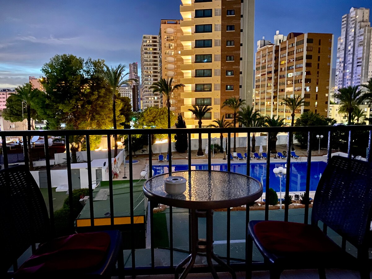 Un appartamento luminoso, ristrutturato, molto confortevole di 50 m2 con un balcone e una bella vista sulla piscina e su Benidorm. L'area piscina dispone di lettini e ombrelloni ad uso gratuito e dispone di bagnino. Situato a 5 minuti a piedi dalla spiaggia di Levante, nell'angolo di Loix, una delle zone con più svago di tutta Benidorm. Circondato da ristoranti, bar, discoteche, supermercati, casinò e mercato, senza bisogno di prendere l'auto. Perfetto per trascorrere un piacevole soggiorno.