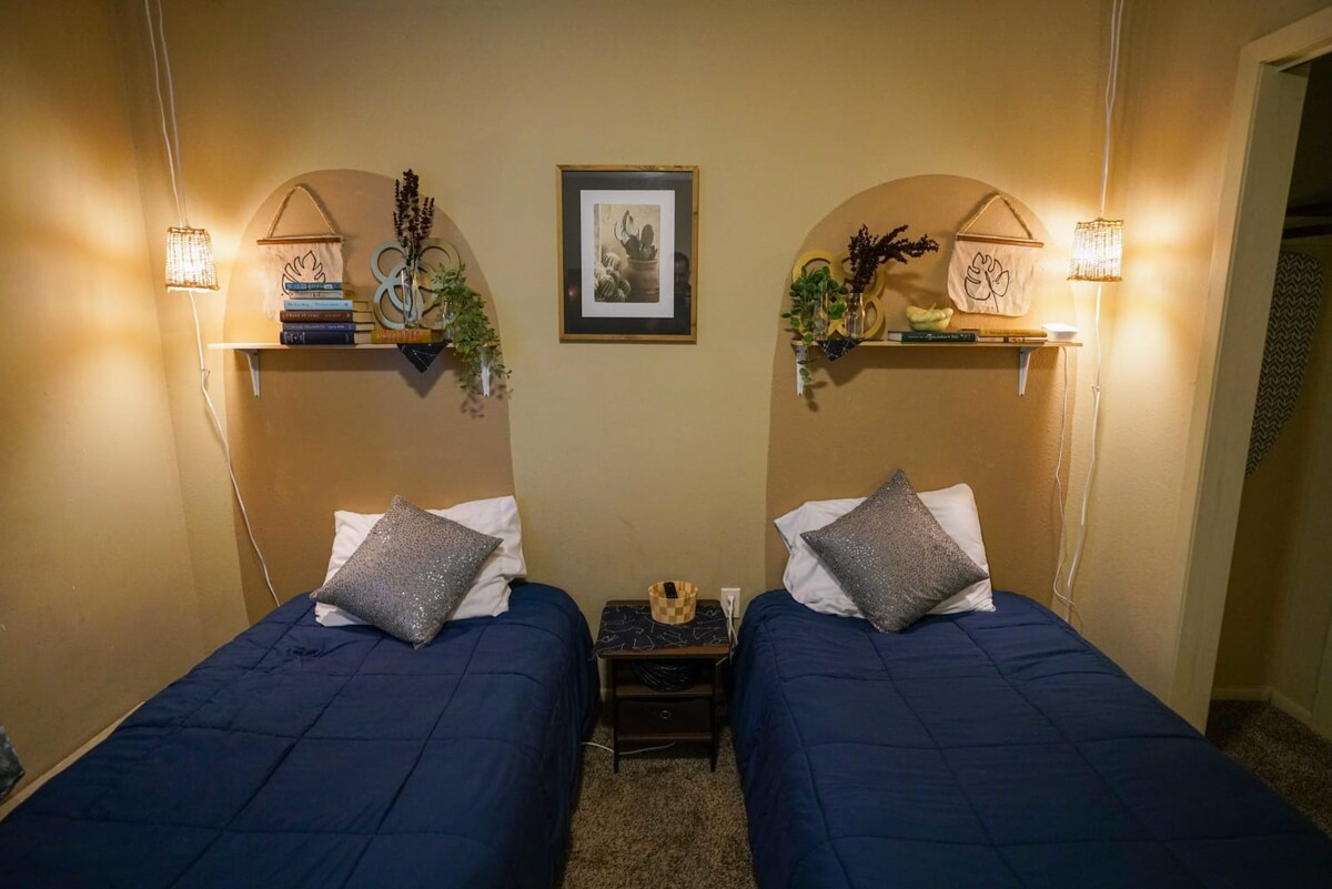 Rifugio privato al piano superiore con 3 letti per 8 persone in lusso: letto king size con vasca idromassaggio privata + toeletta, camera da letto privata, 2 letti queen size, divano letto + extra, tutti in memory foam infusa di carbone e lenzuola premium. Poltrone reclinabili in pelle (8+), TV da 70" con Netflix, YouTube TV, Peacock. Cucina completa e terrazza con griglia a gas + zona pranzo. Aria condizionata centralizzata + mini-split, Wi-Fi da 500 Mbps, accesso con PIN senza contatto. A piedi dal campus MSUM, Vic's Bar (2 isolati); 800 m da negozi di alimentari/DQ; 4 min in Uber dal centro di Fargo. Ideale per gruppi! Prenota ora!