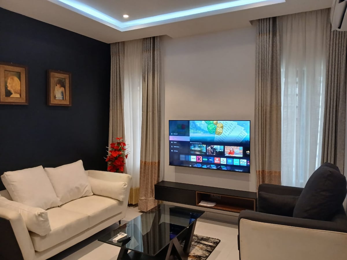 Standard ensuite room with semi orthopedic super king size comfortable mattress, modern bathroom with water heater. Unlimited fast WI-FI, 43inches Smart Tv in the bedroom and 55 inches Smart Tv in the sitting room, Netflix, YouTube, DSTV, Smoke alarm, 24/7 electricity with Band A supply frm the grid make my place unique wit no Blackout, Cctv, maximum security, 10min to International Airport and 5min to Domestic Airport. Sparkling clean, spacious and well organised Apartment for your comfort