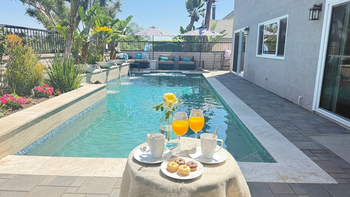 Benvenuti al Chuchu's Luxury Waterfall Retreat a Mission Viejo! 🤗 Spaziosa casa con 6 camere da letto e 3 bagni (8 letti, 2 materassi per un totale di 10 posti letto) – può ospitare 12 persone. Perfetta per famiglie o gruppi! Goditi la piscina privata con cascate, la vasca idromassaggio, la sauna, il barbecue, le rose profumate e il frutteto. Addolcitore d'acqua per tutta la casa per un comfort extra. Vantaggi del lago Mission Viejo: kayak sul lago. A soli 30 minuti da Disneyland, a 25 minuti dalle spiagge e vicino allo Spectrum Shopping. Posto ideale per vacanze indimenticabili!