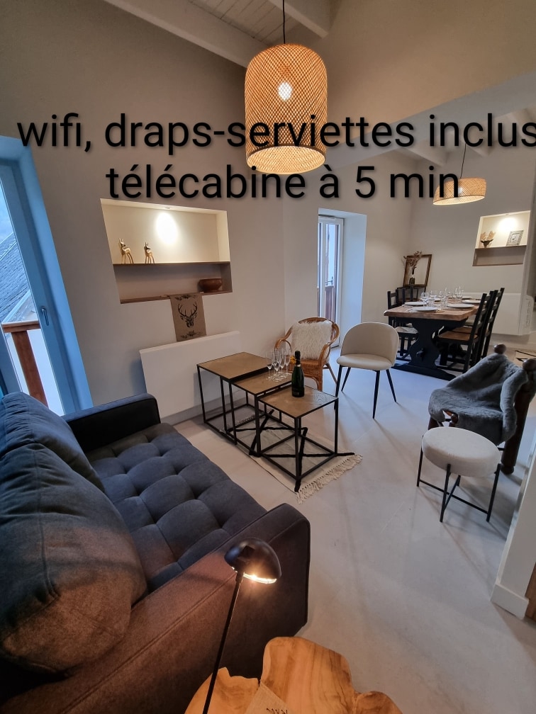 Appartement comprenant 1 chambre avec 1 lit double, coin repas avec four, micro-ondes, salon équipé d'un écran plat avec chaines internationales, wifi, un canapé convertible. Une salle d'eau avec douche, sèche serviettes, et toilettes. Parking privé. Local skis/vélos. Jardin. Navette gratuite pour la gare du telecabine située au centre du village. Possibilité de louer les draps,serviettes pour 20€.