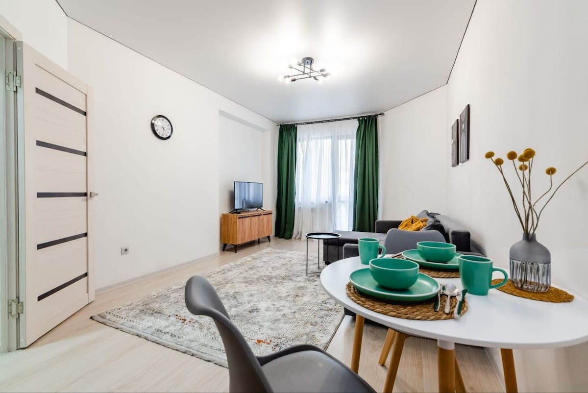 Стильная квартира в самом сердце Алматы — на набережной Esentai, рядом с Esentai Mall, парком и лучшими ресторанами города. Уникальная фреска, уютный камин, дизайнерский декор и вид на горы с 4 этажа создают атмосферу уюта и вдохновения. Полностью оборудованная кухня, техника, винные бокалы и редкие сорта чая. Для гостей при бронировании от 5 ночей — бутылка казахстанского вина Arba Wine в подарок. Пространство 48 м² идеально подойдёт для пары, творческой поездки или путешествия в одиночку.