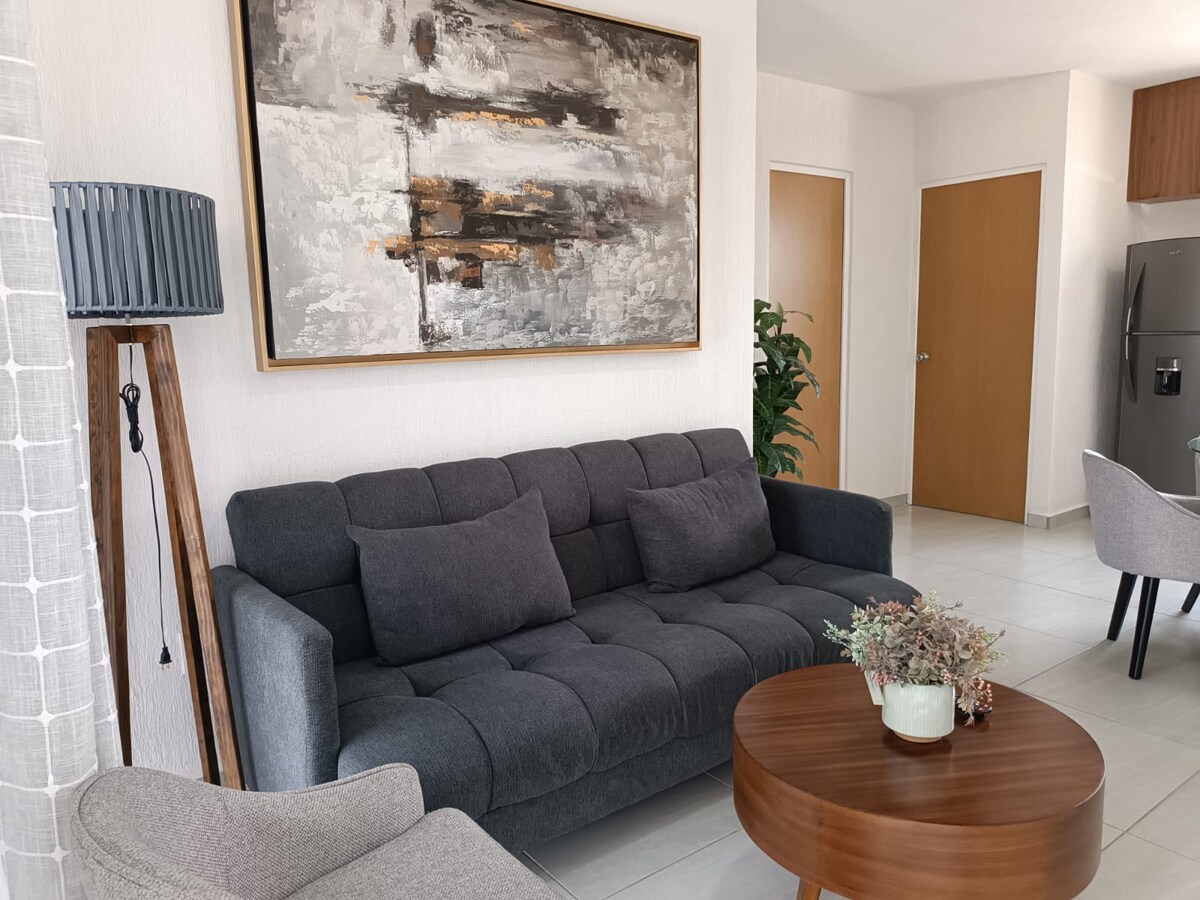 L'appartamento dispone di aria condizionata nella CAMERA DA LETTO PRINCIPALE. Il servizio è a pagamento e viene richiesto separatamente. Costo aggiuntivo di 99,00 pesos al giorno. Rilassati in questo spazio tranquillo ed elegante. Completamente nuovo con due camere da letto. Spazioso per 4 ospiti. Con opzione per un 5° [a pagamento]. Con servizi [palestra, ludoteca, spazio di lavoro, cinema]. Ottima posizione. Nel sud della città. A 5 minuti dalle piazze e dai supermercati. Renderemo il tuo soggiorno piacevole.