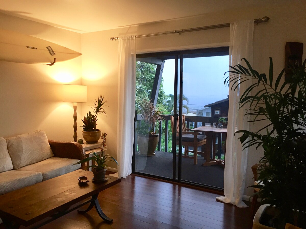 Aloha! Fuggi in questo romantico rifugio con 1 camera da letto dal design lussuoso e dotato di aria condizionata. Dormi sonni tranquilli in un letto Cal King con baldacchino in teak, cucina in una cucina elegante con elettrodomestici in acciaio inossidabile e goditi la comodità di una lavatrice/asciugatrice all'interno dell'unità. Rilassati sulla tua veranda privata con splendide viste sull'oceano, che si affaccia su un lussureggiante giardino tropicale pieno di alberi da frutto e canti di uccelli. Un *tablet* personalizzato offre consigli locali, informazioni sull'alloggio e altro ancora. Gli ospiti amano il comfort e l'atmosfera autentica del nostro quartiere hawaiano.