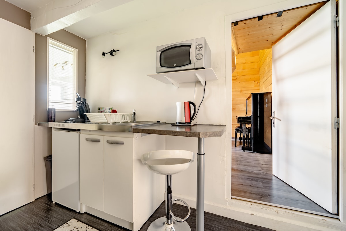Alloggio nel comune di Bard, a 5 minuti di auto da Montbrison, eletto il più bel mercato di Francia nel 2019. - Cucina completamente attrezzata con molti armadi + stoviglie... Lavastoviglie, Forno + piano cottura a induzione, Cappa, Microonde, Frigorifero + congelatore, Lavatrice/Asciugatrice. - Soggiorno con TV, tavolo + sedie + divano letto (140cmx190cm). Di un WC. - Una grande camera da letto con cabina armadio, scrivania + sedia, letto matrimoniale (160cmx190cm) + TV - Un bagno. - Esterno