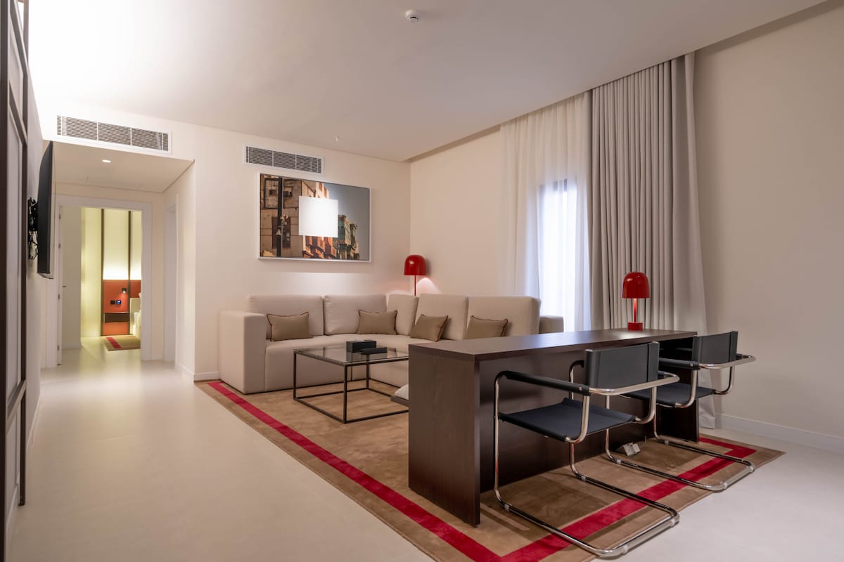 Un appartamento in hotel composto da un soggiorno, una camera da letto e Cucina attrezzata con tutti gli utensili da cucina. Internet veloce per l'appartamento e uno schermo smart da 75 pollici Dispone di un account Shahid e Ossen + C'è un'area di lavoro e un angolo caffè che può ospitare quattro persone L'appartamento si trova al piano terra e le porte sono insonorizzate Autobloccaggio della porta dell'appartamento e della porta del palazzo Vicino agli eventi della Riyadh Season Le strutture pubbliche esterne sono monitorate da telecamere di sicurezza per garantire sicurezza e privacy. Di fronte all'edificio è disponibile un parcheggio privato Un luogo tranquillo vicino a tutti i servizi. Forniamo un servizio di pulizia giornaliero e, su richiesta, è possibile aggiungere materassi.