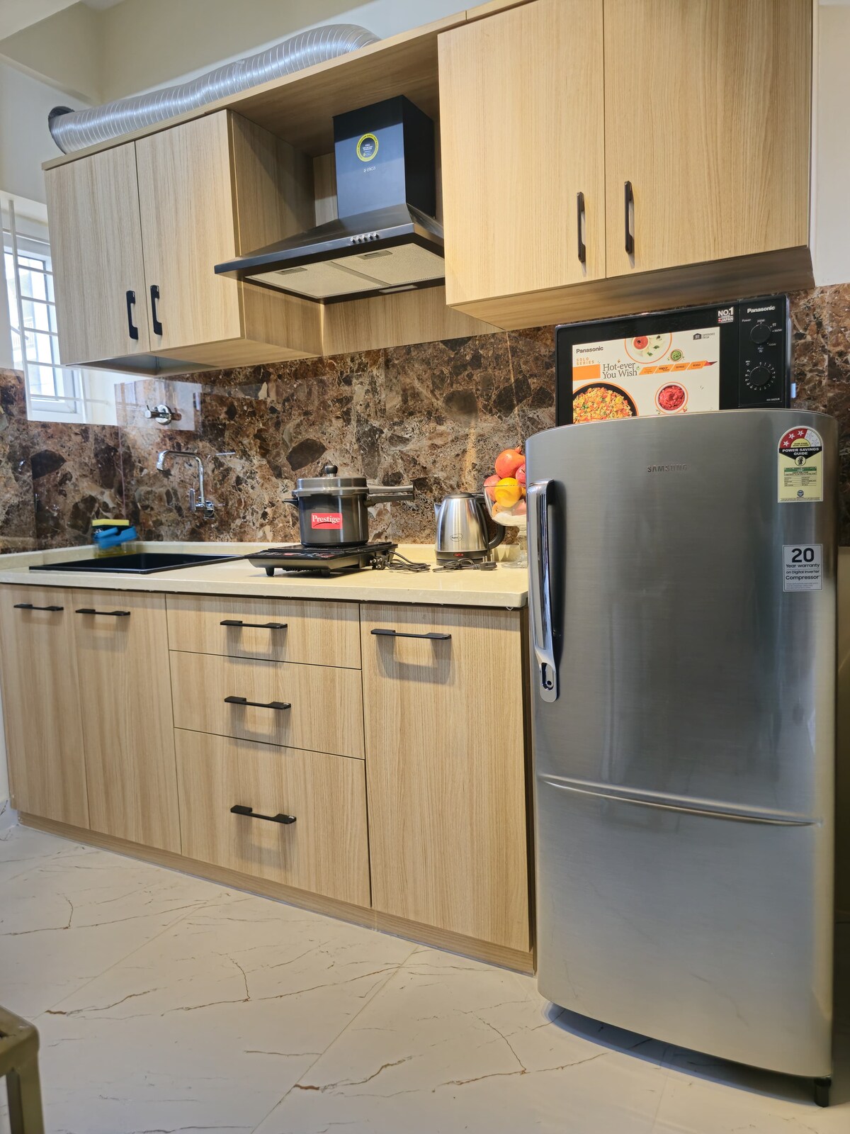 Entra in un moderno e spazioso appartamento con 4 camere da letto e 3 bagni con poltrona reclinabile, Wi-Fi, TV da 55", frigorifero, cucina completamente attrezzata con allaccio al gas, forno a microonde, friggitrice ad aria, grill e zona pranzo. Accesso alla piscina nella club house a 150 rupie a persona dalle 7:30 alle 17:30 I punti salienti della casa includono: • 🛁 Bagno lussuoso con vasca e acqua calda • 🏠 Servizio di pulizia giornaliero + generi alimentari di base • 🌿 Due balconi + terrazza aperta con vista verde rinfrescante • 🧺 Area di servizio con lavatrice per soggiorni più lunghi