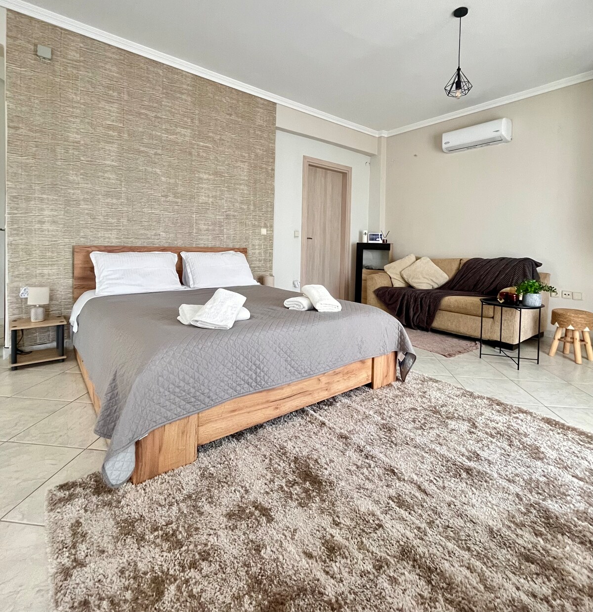 Nuovissimo monolocale con arredamento moderno, un letto matrimoniale unico e intricati disegni del controsoffitto (38 m²). Il monolocale si trova nel centro della città e dista meno di 10 minuti dall'aeroporto e da molti centri commerciali. Con una passeggiata di 3 minuti puoi vedere la piazza della città e in 10 minuti puoi essere alla diga di Thermi. Se hai voglia di nuotare, puoi visitare Halkidiki in 30 minuti.