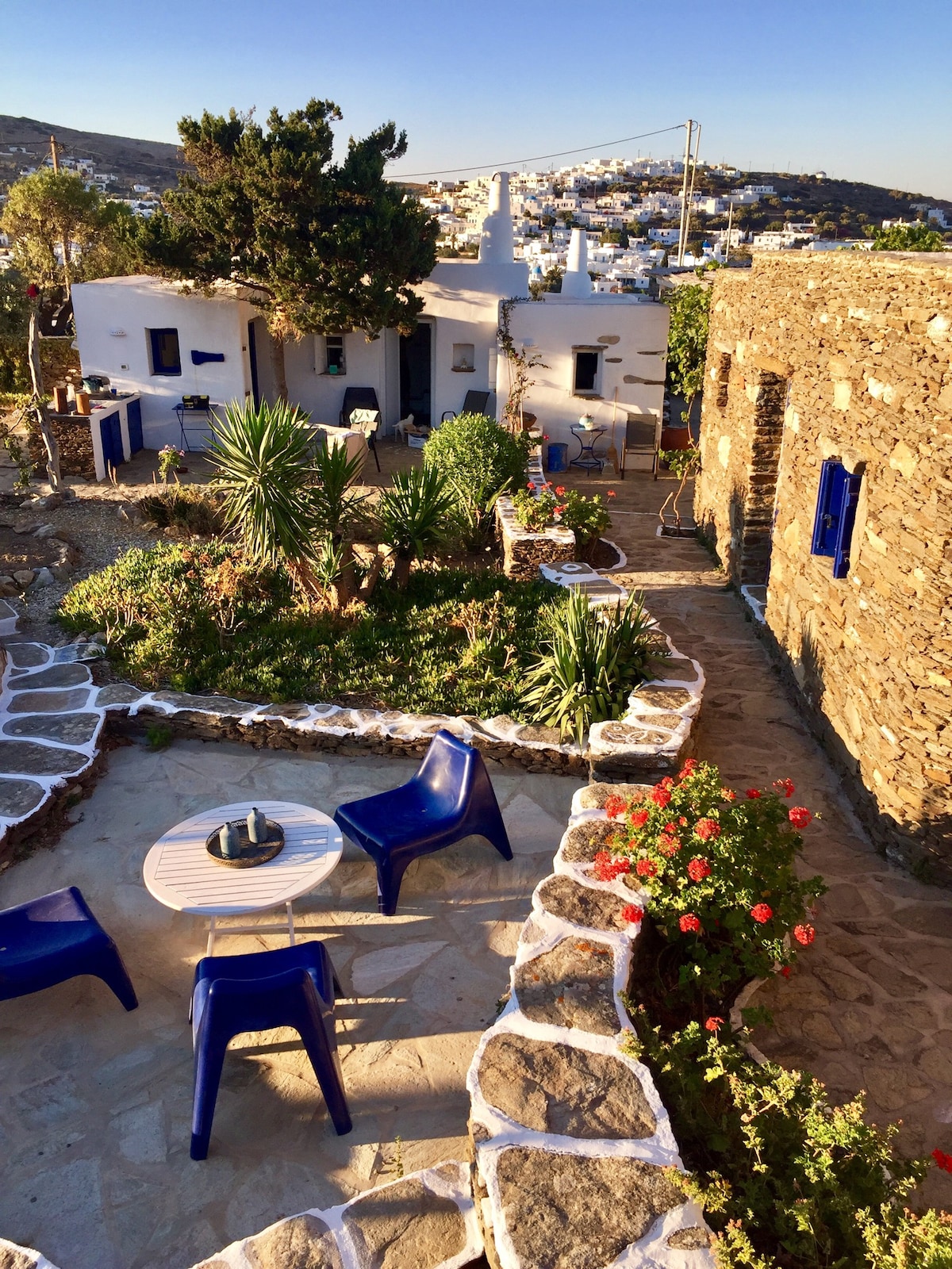 Benvenuto nel nostro cottage tradizionale, in pietra, tranquillo ed elegante. Trascorrerai una vacanza indimenticabile in una casa di campagna con vista panoramica e sul mare, alberi da frutto, piante e viti in un giardino di 1.100 m², a soli 7-8 minuti a piedi dal centro della capitale Apollonia. Il ristorante più vicino dista circa 150 metri. I proprietari, che vivono nello stesso cortile di 1100 m² e hanno viaggiato molto in tutto il mondo, ti offriranno la famosa ospitalità tradizionale greca.
