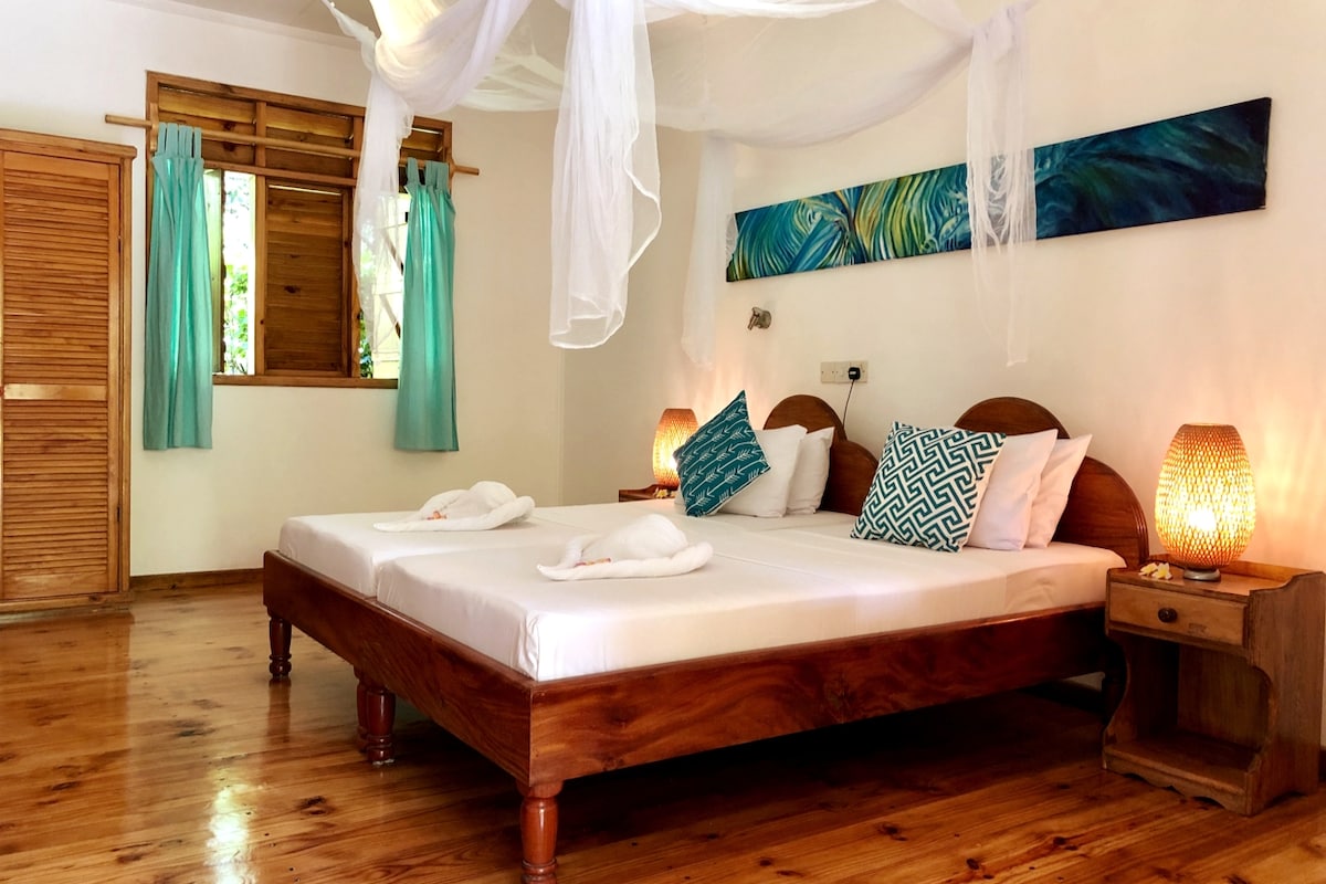 Ammira la vista più bella dell'Oceano Indiano sull'isola di La Digue. Riposati in uno spazio tranquillo, nascosto nella foresta pluviale sempreverde sulla cima della collina dell'isola di La Digue. Soggiorna in una bella casa in legno, tradizionale e creola, costruita da un artista locale. Svegliati con il canto degli uccelli esotici. Medita con vista sull'Oceano Indiano. Prova gli avocado biologici, le papaie e il frutto del pane dell'orto della casa. Assaggia il miglior pesce del mondo alla griglia in stile creolo preparato dal tuo simpatico host.