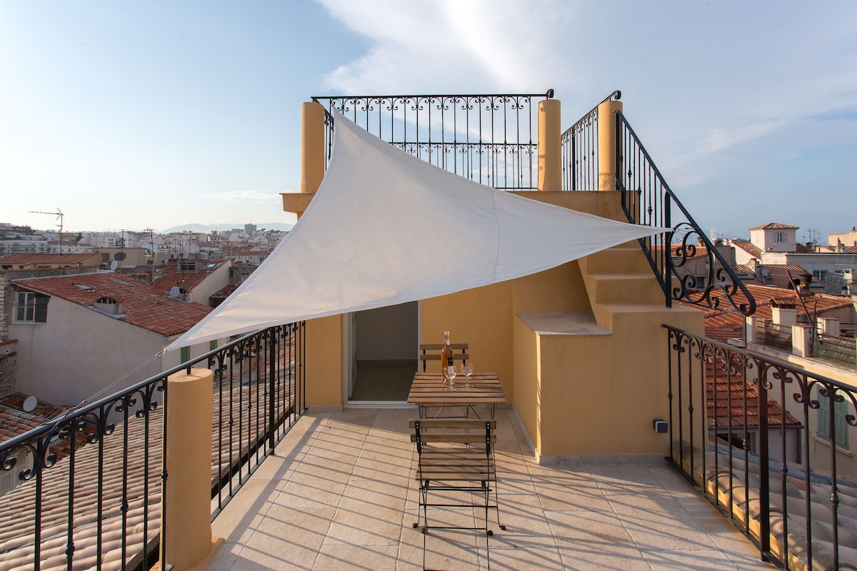 My flat is situated in the heart of the "Vieil Antibes" while being very quiet. It benefits from one of the highest terrace of the old town with an exceptional view on the roofs, the montains and the sea, you'll love havinyour breakfast there! My accomodation is also close to all commodities, shopping area, public transportation, restaurants. A public car park is within 5mn walk. We renovated the flat with first class equipment including air con, wifi, flat screen tv and a high quality sofa bed.