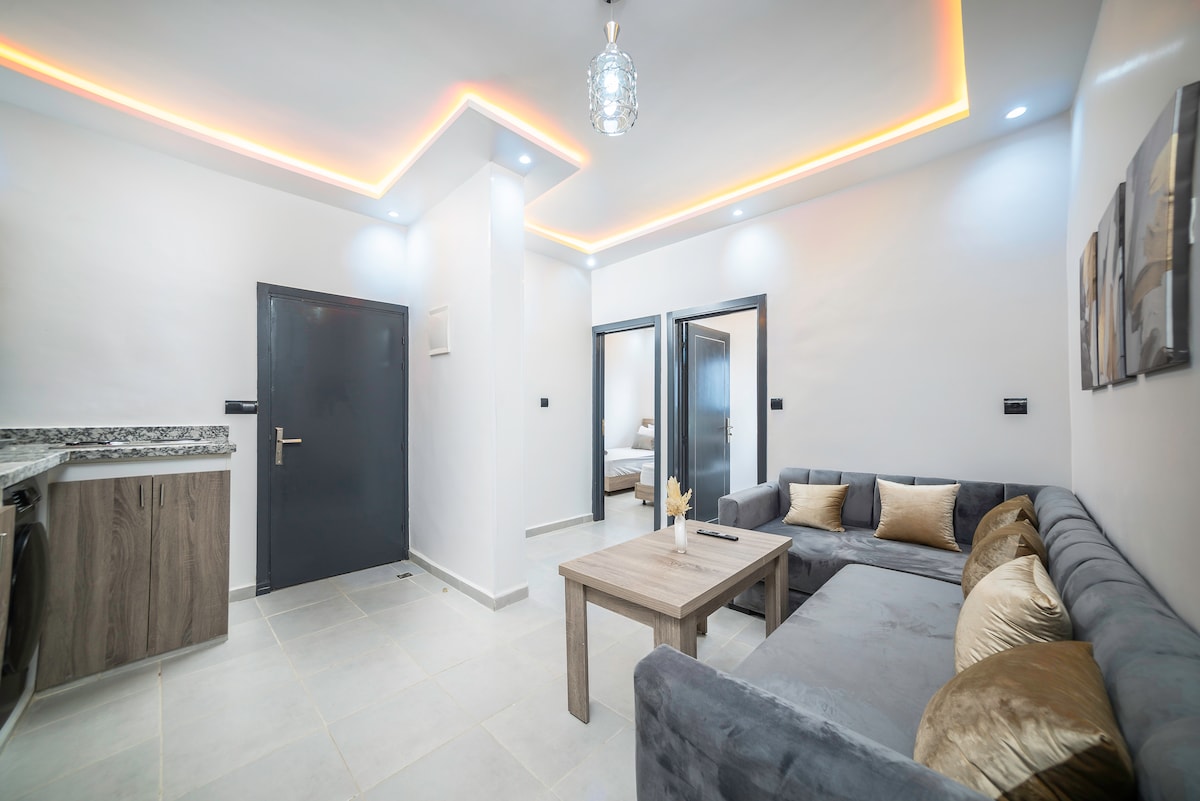 Fuji Home, un appartamento di classe ed elegante situato in una residenza guaded caratterizzata dal mare e dalla sua posizione strategica con vista sulla funivia e sul monumento storico, Kasbah. Il nostro appartamento ha due camere da letto, ognuna con il proprio bagno e un balcone con vista sulla funivia, e un soggiorno con un tavolo da pranzo in vetro e una piccola biblioteca. C'è una cucina dove è possibile preparare le ricette più deliziose, con una connessione internet veloce in modo da poter godere dei programmi e una serratura intelligente sulla porta. Goditi la tua vacanza