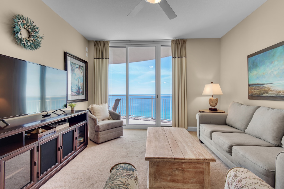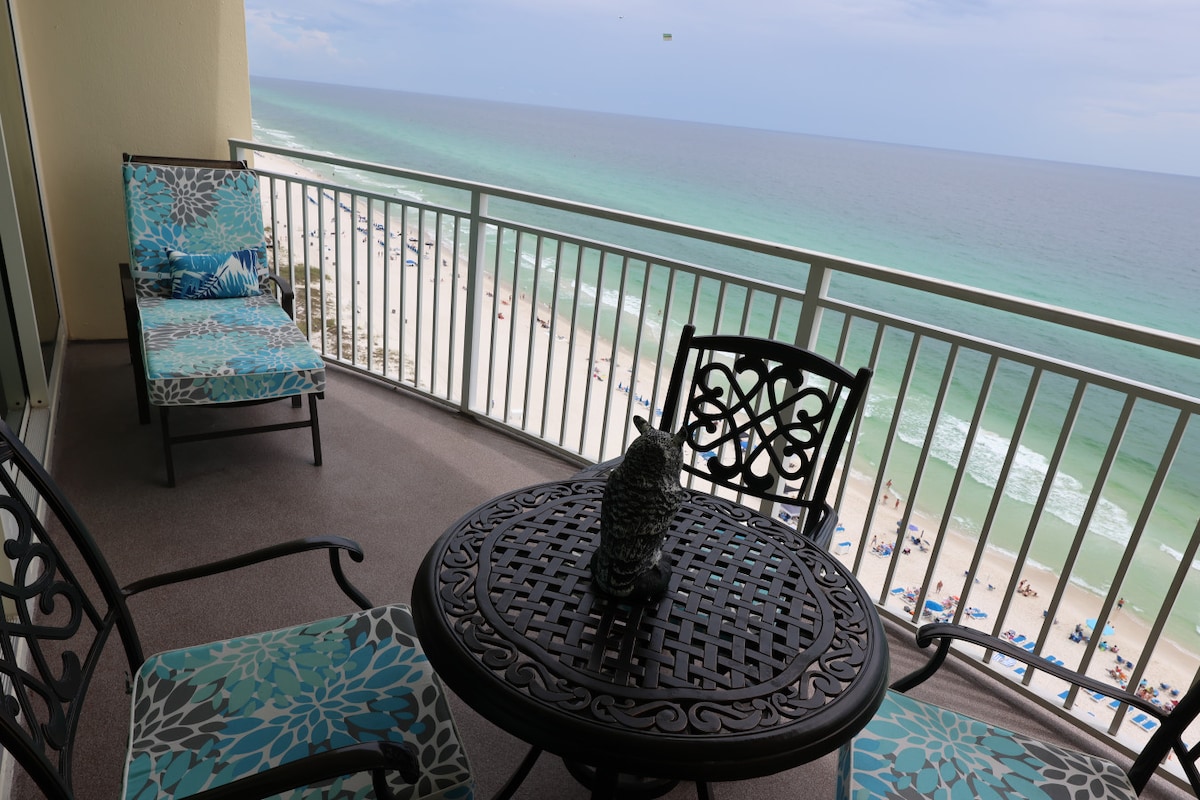 Gulf Getaway PCB | Condominio al 17° piano con 1 camera da letto e 2 bagni e vista mozzafiato sul Golfo! Allestimento spiaggia GRATUITO (2 sedie + ombrellone, marzo-ottobre 2026). Immagina di rilassarti sul balcone, di tuffarti in piscina o di grigliare la cena dopo il tramonto. Sistema WiFi super veloce, 2 smart TV, lavatrice/asciugatrice, cucina ben attrezzata e grill elettrico sul balcone. Vasca idromassaggio, braciere e atmosfera rilassante inclusi. È richiesto il Resort Pass da 50 USD (0-1 auto per soggiorno), 100 USD per 2 pagati separatamente. I fine settimana vanno a ruba, ma abbiamo ottime tariffe nei giorni feriali!