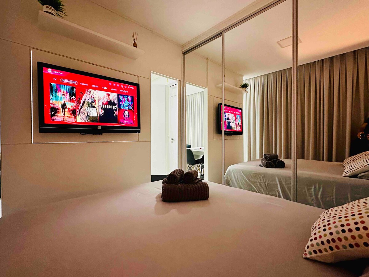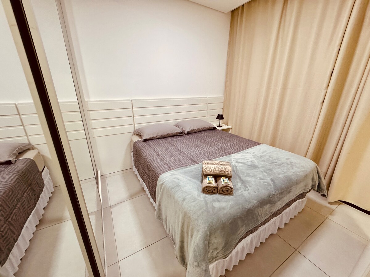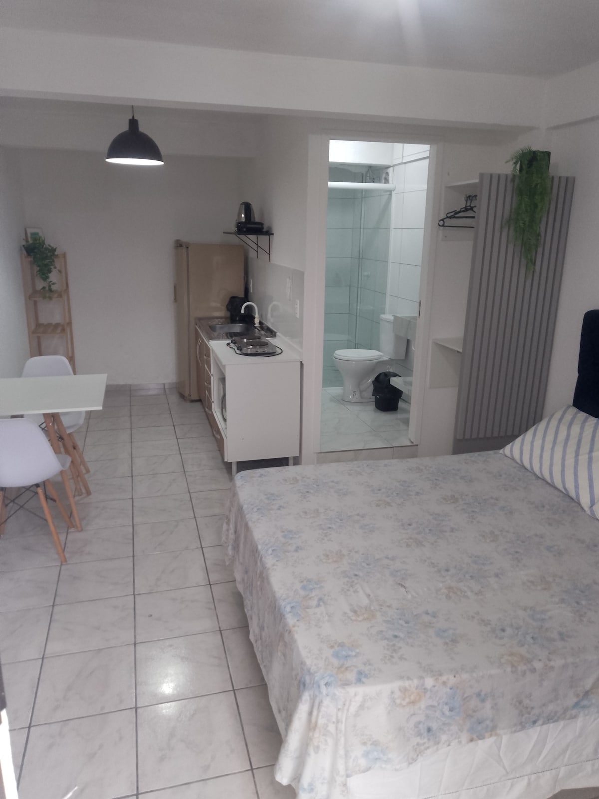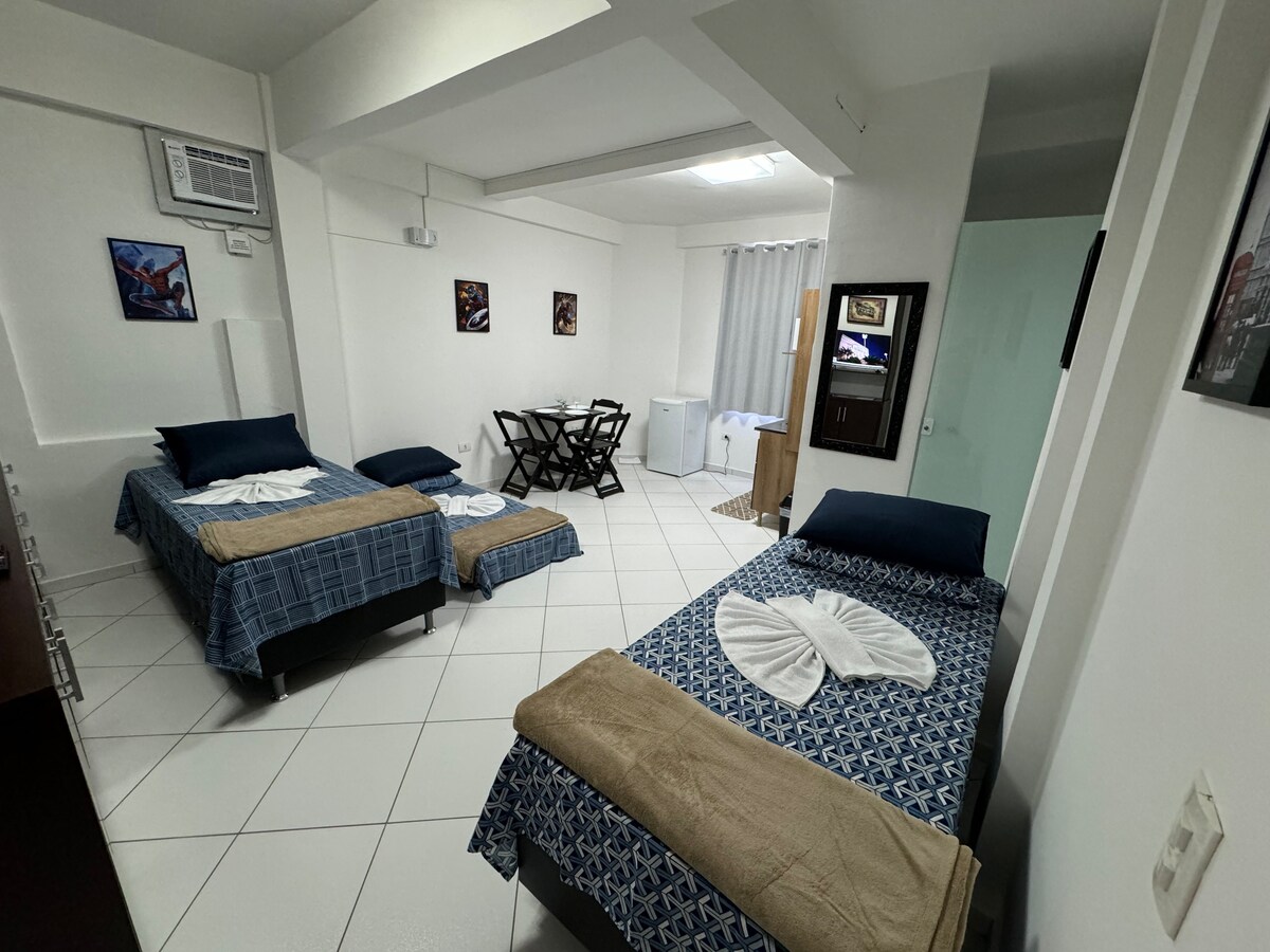 O Studio possui cozinha e quarto integrado, sacada e banheiro. Andar alto com elevador. Uma vaga de garagem. Próximo a rodoviária. Possui uma cama de casal Queen (colchão magnético), com opção de + 1 colchão de solteiro no chão (com cobrança de taxa extra p/ o 3°hospede). *Para que a reserva seja efetivada é necessário informar o nome de todos os hóspedes. O congelador pode não estar disponível, pois utilizamos o apto quando não há reservas. NÃO ACEITAMOS RESERVAS DESTINADAS A ENCONTROS!
