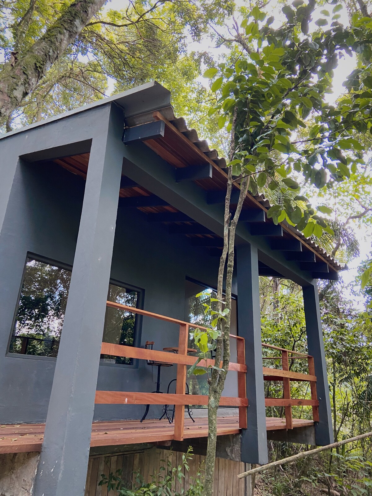Realizzata da noi, è integrata nella natura e ha una vista incredibile, ideale per vedere l'alba e il tramonto, per stare tranquilli nella vasca da bagno, sul divano o sotto un albero, ha un letto matrimoniale e un divano letto, frigorifero, fornelli, doccia e vasca da bagno a gas, ha un barbecue e un posto per il fuoco accanto. Dal parcheggio alla capanna c'è una salita di 50 metri, ha una scala Santos Dumont inclinata per accedere al secondo piano. Abbiamo un mercato esclusivo per gli ospiti.