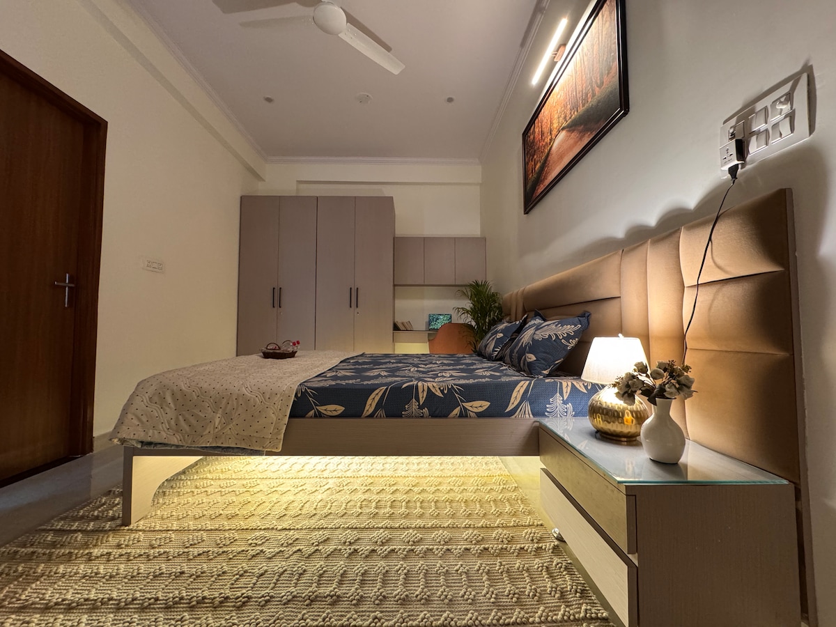 Benvenuti a Lake Pichhola Villa, un ampio rifugio al primo piano con due camere da letto ariose, ognuna con aria condizionata e bagno in camera. Un geyser in una stanza più grande fornisce acqua calda a entrambi. Rilassati nella grande sala, distenditi sul balcone esposto a est con piante o goditi l'accesso alla terrazza al secondo piano. La cucina è modestamente attrezzata per tè, caffè o spuntini leggeri. Con WiFi a 100 Mbps e un affidabile sistema di backup dell'alimentazione, è un soggiorno ideale per famiglie, amici o lavoratori a distanza che cercano comfort vicino al fascino di Udaipur.