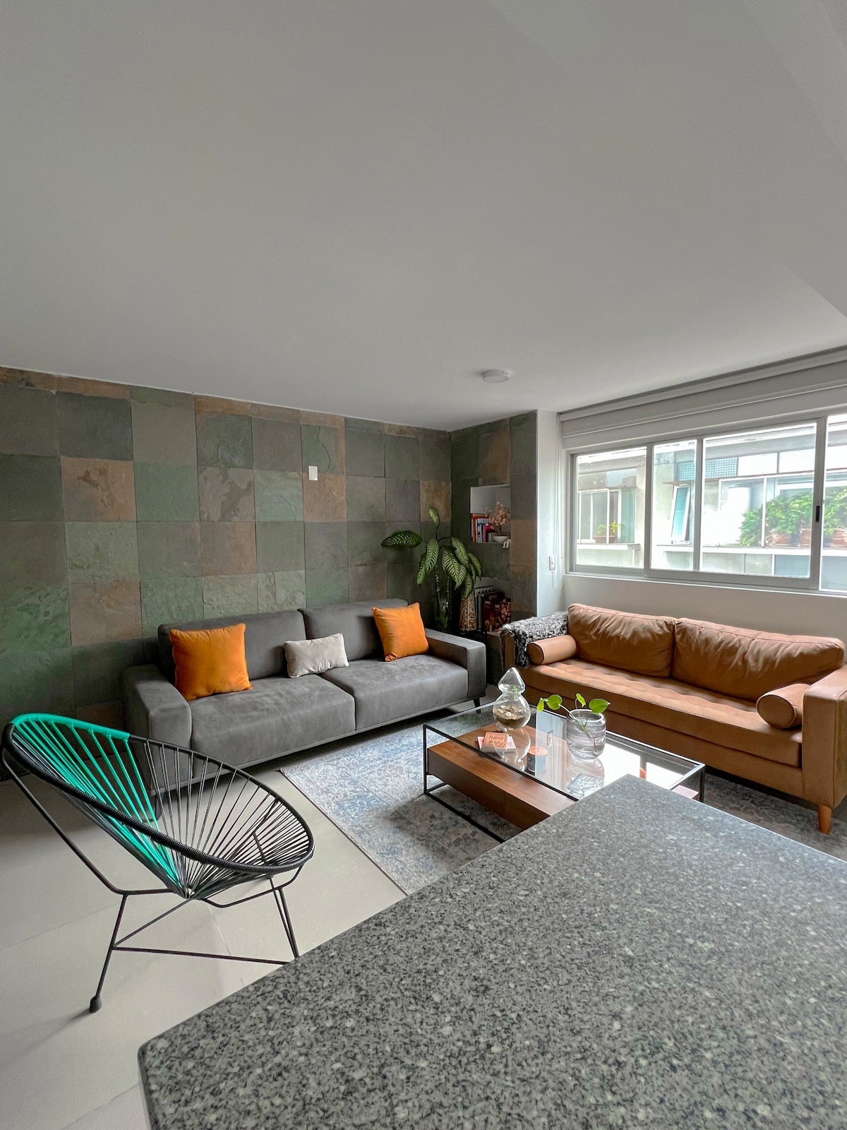 Push open folding big doors first thing in the morning and step onto a green patio for a blast of fresh air and daylight. The big floor to ceiling doors keeps the apt ventilated and fresh. High ceilings with clay and wood beams, bunch of light, and artesanal tiles and wood floor. The place is silent, carefully decorated, very nice for work or just to be here. This new one: https://www.airbnb.mx/rooms/1604605046335668118?guests=1&adults=1&s=67&unique_share_id=4dd1b1c9-fc93-4c94-9ca1-c91cd0256dae