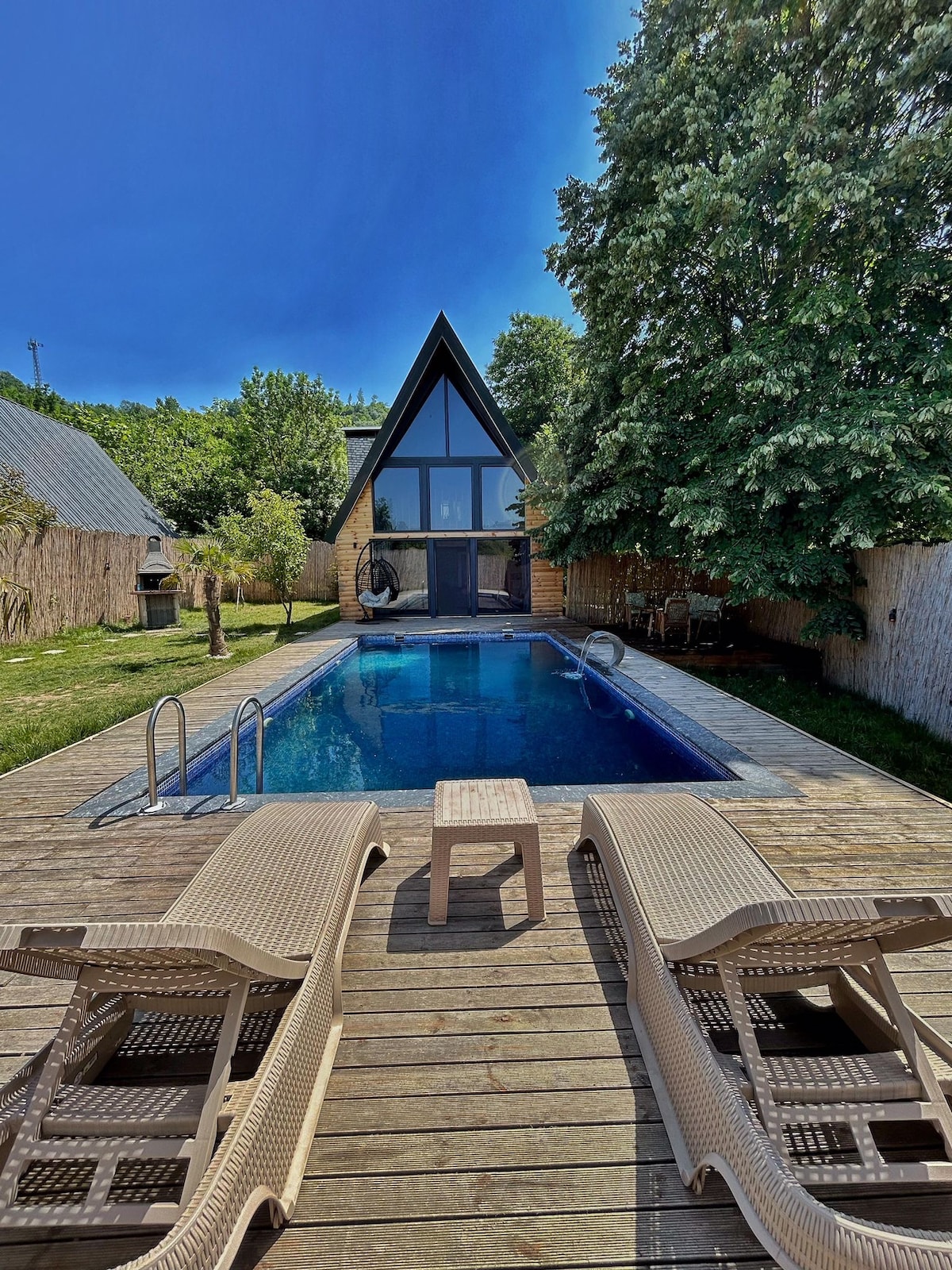tamamem bahçe içerisinde müstakil taş bungalov 2 oda 2 banyomuz mevcuttur salondaki kanepeler ile 6 kişi konaklıyabilir bahçede barbekü ve ateş çukurumuz ve kapalı kamelyamız bulunmaktadır bir evde bulunması gerek bütün mutfak malzemeleri vardır 3x7 metre büyüklüğünde havuzumuz tamamen korunaklıdır gelen misafirlerimizin aile üyeleri veya kız arkadaş grupları olmalarını terciğ ediyorum teşekkürler havuzumuz ısıtmalıdır