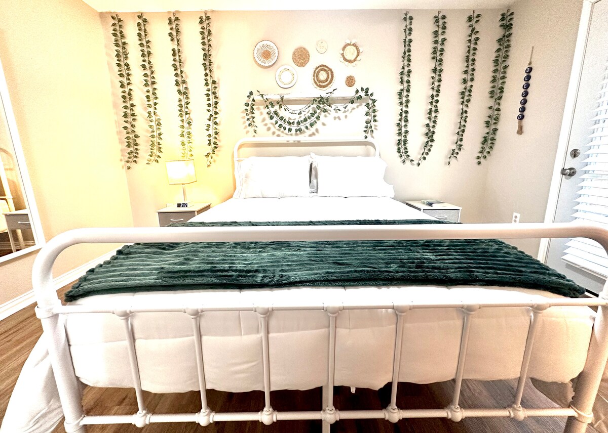La comodità di un rifugio ad Arlington a 6 minuti a piedi dall'AT&T Stadium, dal Globe Life Park o dal Choctaw Stadium! Non solo un alloggio, ma un luogo per giocare! Gioca a biliardo o lancia le freccette mentre riproduci in streaming le tue app preferite sulla nostra TV HD 4K da 65 pollici. Rilassati con stile grazie a biancheria da letto e asciugamani di lusso, ogni camera con TV privata, o goditi un cortile privato con giochi di coda. Appartamento al piano terra con posto auto GRATUITO: non dover guidare o prendere un taxi il giorno della partita è un vero vantaggio. A 5 minuti di auto da Six Flags e HH!