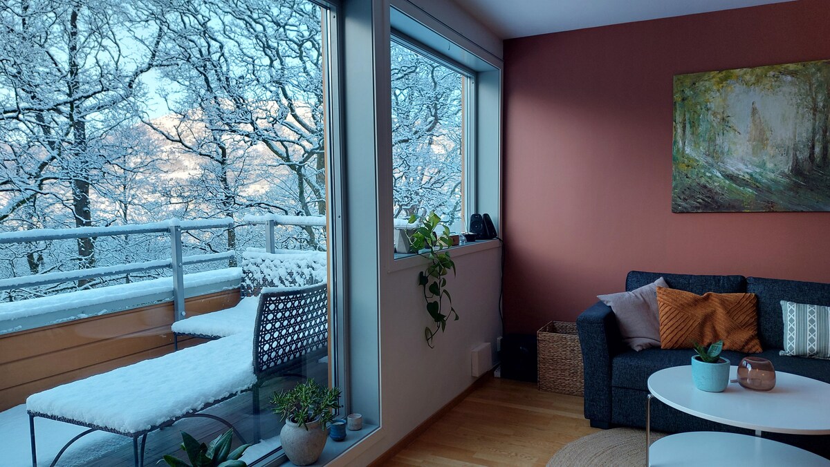 Questo esclusivo appartamento tra gli alberi, situato accanto a un parco tranquillo, dista solo 12 minuti di autobus dal cuore di Bergen ed è facilmente raggiungibile dall'aeroporto o dalla stazione ferroviaria. La fermata dell'autobus è letteralmente accanto al portone d'ingresso, e gli autobus partono ogni 5-10 minuti. Qui troverai privacy completa e un'atmosfera tranquilla e silenziosa. L'appartamento è moderno e confortevole; il balcone esposto a sud, che si affaccia sul bellissimo parco storico, è il luogo ideale per ricaricarsi.