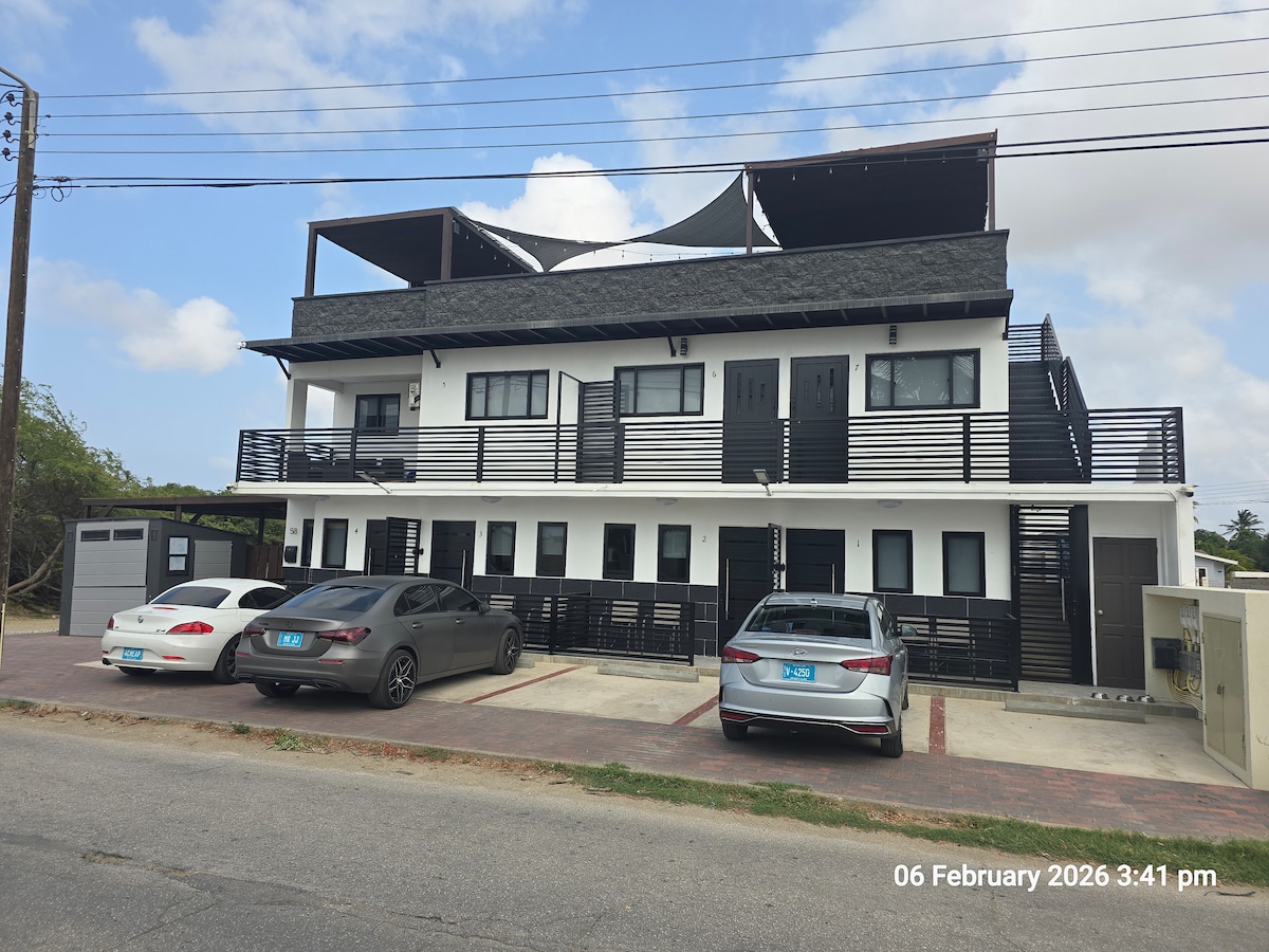 Nuovissimo monolocale situato vicino a Eagle Beach (tra le 20 migliori spiagge del mondo), raggiungibile a piedi in 15 minuti. Ottimo rifugio per coppie. Grande supermercato e centro commerciale a 10 minuti a piedi. Il monolocale dispone di un letto matrimoniale europeo (più grande di quelli americani), armadio completo, 2 sedie, tavolo, TV 44 pollici 4k ad alta definizione con oltre 200 canali e Netflix, lenzuola e asciugamani, sapone, asciugacapelli e shampoo di cortesia. Anche il set per barbecue all'aperto è un vantaggio.
