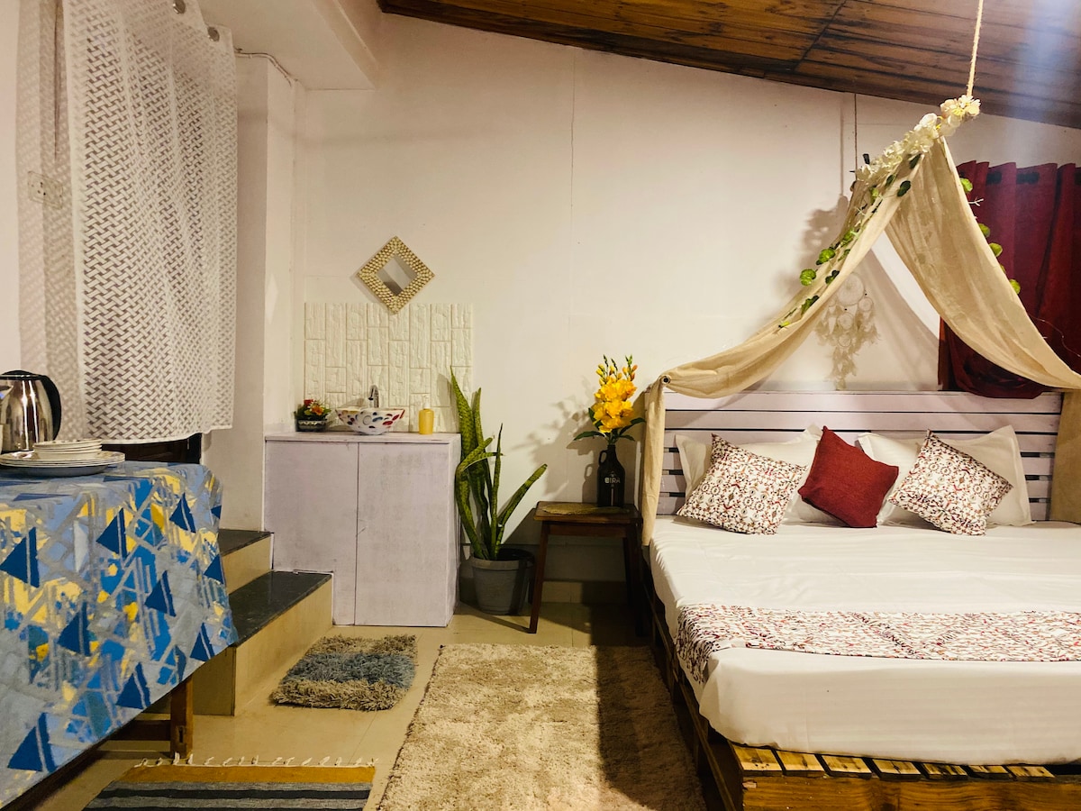 Non vorrai più lasciare questo posto incantevole, unico nel suo genere. Immersa a North Goa, questa è una spaziosa camera da letto con aria condizionata e acqua corrente calda/ fredda. La stanza è decorata artisticamente con dipinti esclusivi in legno e dipinti di fondatori provenienti dall'Egitto. Disponiamo di una piscina funzionale di grandi dimensioni per i tuoi momenti. Avrai una connessione wi-fi individuale per il tuo lavoro e un televisore per l'intrattenimento. Possiamo organizzare feste per gruppi numerosi qui.