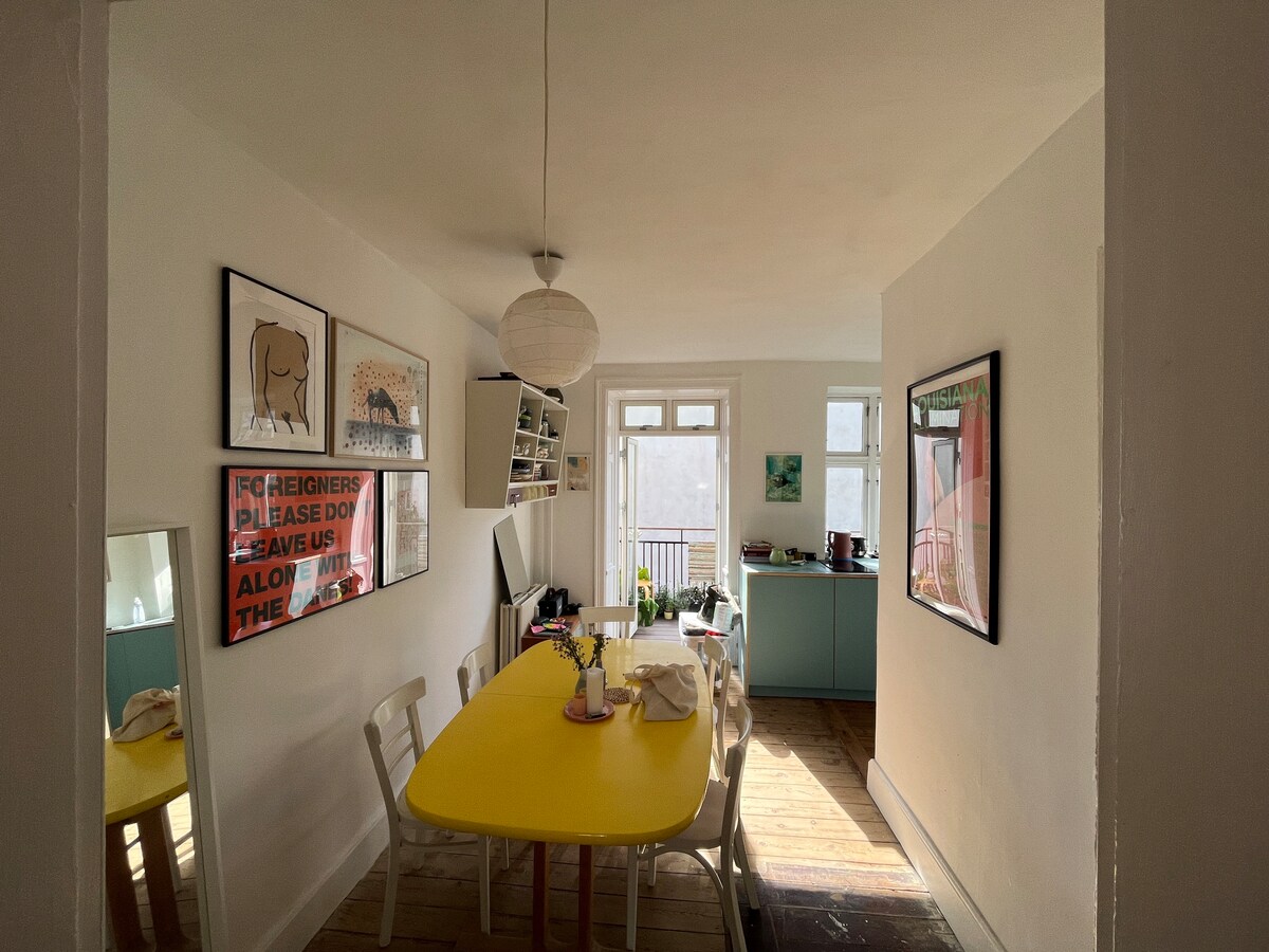Enjoy a lovely Nørrebro apartement with a nice decor and a large bathroom. Look forward to sun on the two balconies all day long. Perfect location close to Metros, green outdoor areas and a lot of cafes and restaurants. Big living room with entrance, kitchen and access to balcony. Smaller TV room and a beautiful bedroom (bed 160) with access to balcony towards the yard. Bathroom with shower. Very cozy and lively neighborhood close to the Cementery Assistens and the hip street Jægersborggade.