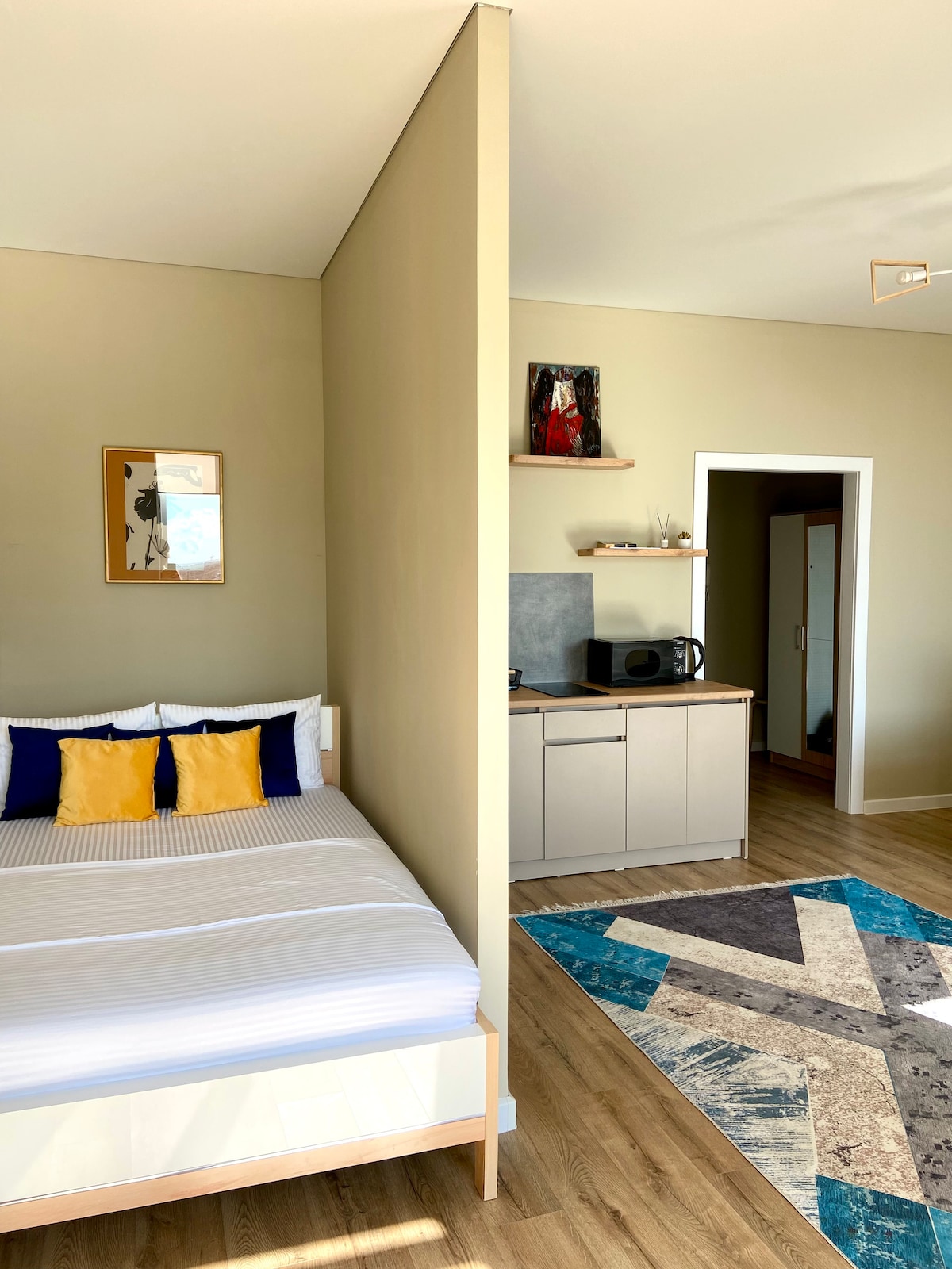 Cari ospiti, troverete un accogliente bilocale con ristrutturazione moderna e di alta qualità dai colori calmi. Nel nostro appartamento ci si può rilassare dopo una lunga giornata e rilassarsi. La camera da letto ha un comodo letto con materasso ortopedico per te, la cucina ha tutti gli elettrodomestici e gli utensili necessari per cucinare. Il bagno ha una ampia doccia.
