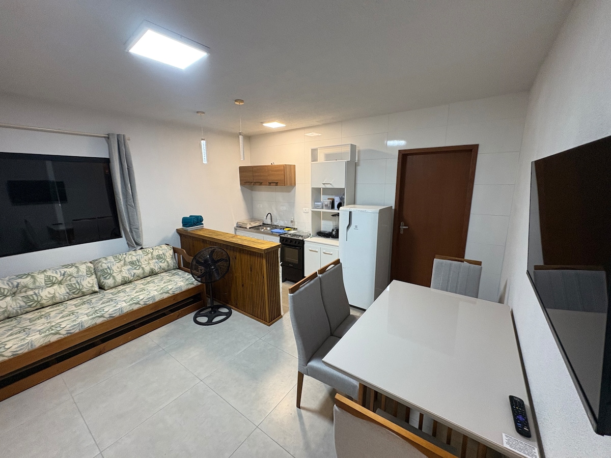 Si trova a 1 isolato dalla spiaggia. Con soggiorno/cucina (bicama) + 1 camera da letto (suite, letto matrimoniale), ha tutti i comfort per permettere all'ospite di risparmiare e cucinare in loco (fornelli, frigorifero e utensili per la casa, barbecue e lavanderia all'aperto). Può ospitare fino a 4 persone. Si trova sul retro della mia casa, ha un cancello divisorio tra le case. Gli animali domestici sono ammessi, purché siano docili. L'auto deve essere parcheggiata parallelamente alla strada (quartiere tranquillo). Avvisa che il check-in dopo le 21:00 sarà valutato.