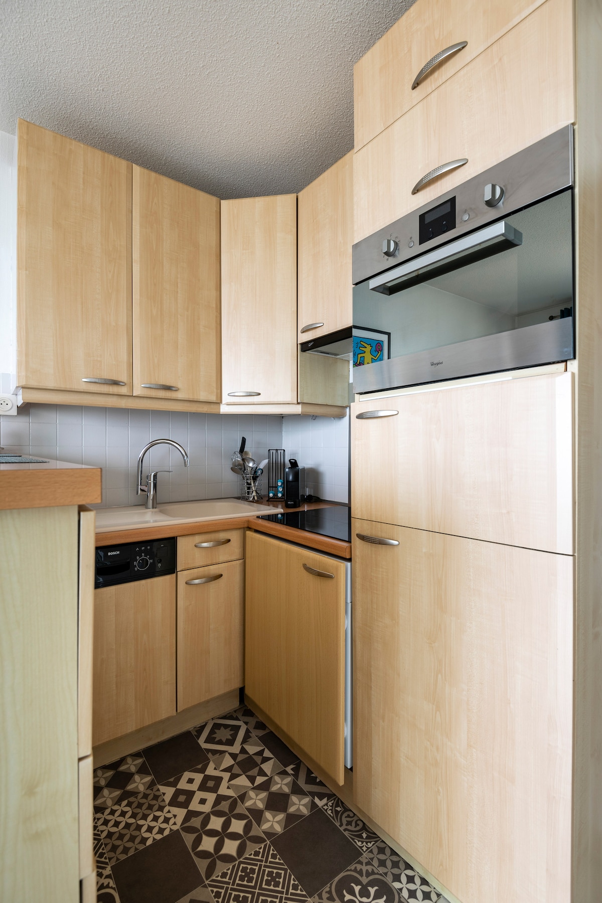 Duplex T2 molto luminoso in una residenza tranquilla con ascensore Ingresso con armadi, bagno, soggiorno con divano letto comodissimo (130x190) e cucina attrezzata. Camera da letto mansardata di 15 m² (2/3 sopra 1,80 m), comodissimo letto 160x200, lavandino. Balcone Gradini sfalsati non adatti a persone con ridotta mobilità o bambini piccoli. Parcheggio privato Lavatrice, frigo, freezer, forno, microonde, TV, aspirapolvere, Vicinanza al porto, alla spiaggia, ai negozi e alle biciclette.