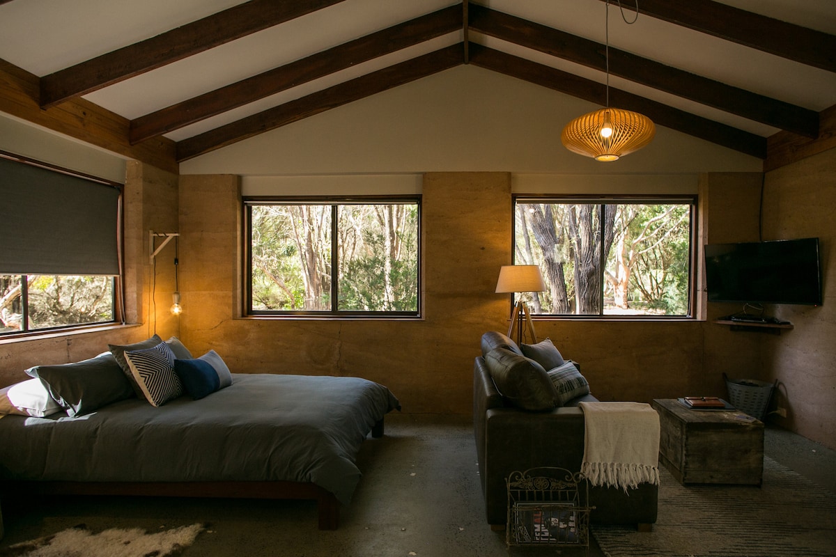 Cascade Cottage is our couples retreat built of stone and rammed earth sourced from the property. Our Studios are built of stone and rammed earth, have cozy queen beds with beautiful fresh linens and super warm donnas. This cottage has a fully self contained open plan kitchen and a spacious bathroom with a beautiful claw footed bathtub.