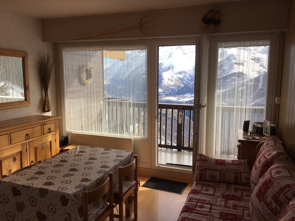 Appartamento (26 m2) recentemente ristrutturato a nuovo è a 200 m dal fronte della neve composto da: - cucina attrezzata: lavastoviglie , microonde , bollitore , tostapane, raclette , apparecchio per fonduta , plancha, forno ,robot da cucina , caffettiera , piastra induzione . - 6 posti letto (in camera: letto matrimoniale e 2 letti singoli, divano letto nella stanza principale) - un balcone sud est con vista mozzafiato sulla Meije e sulle 2 alpi. Biancheria di casa non fornita.